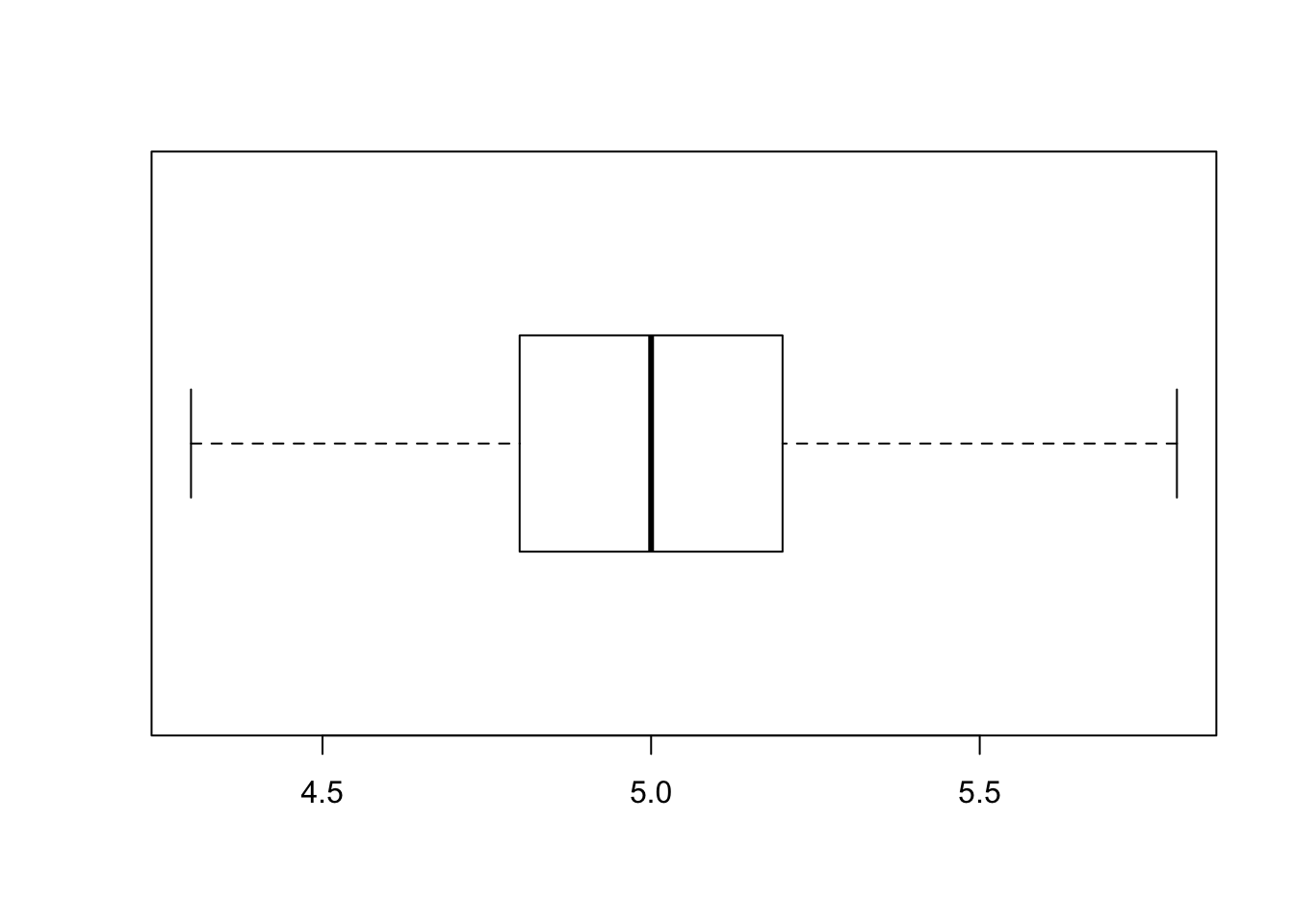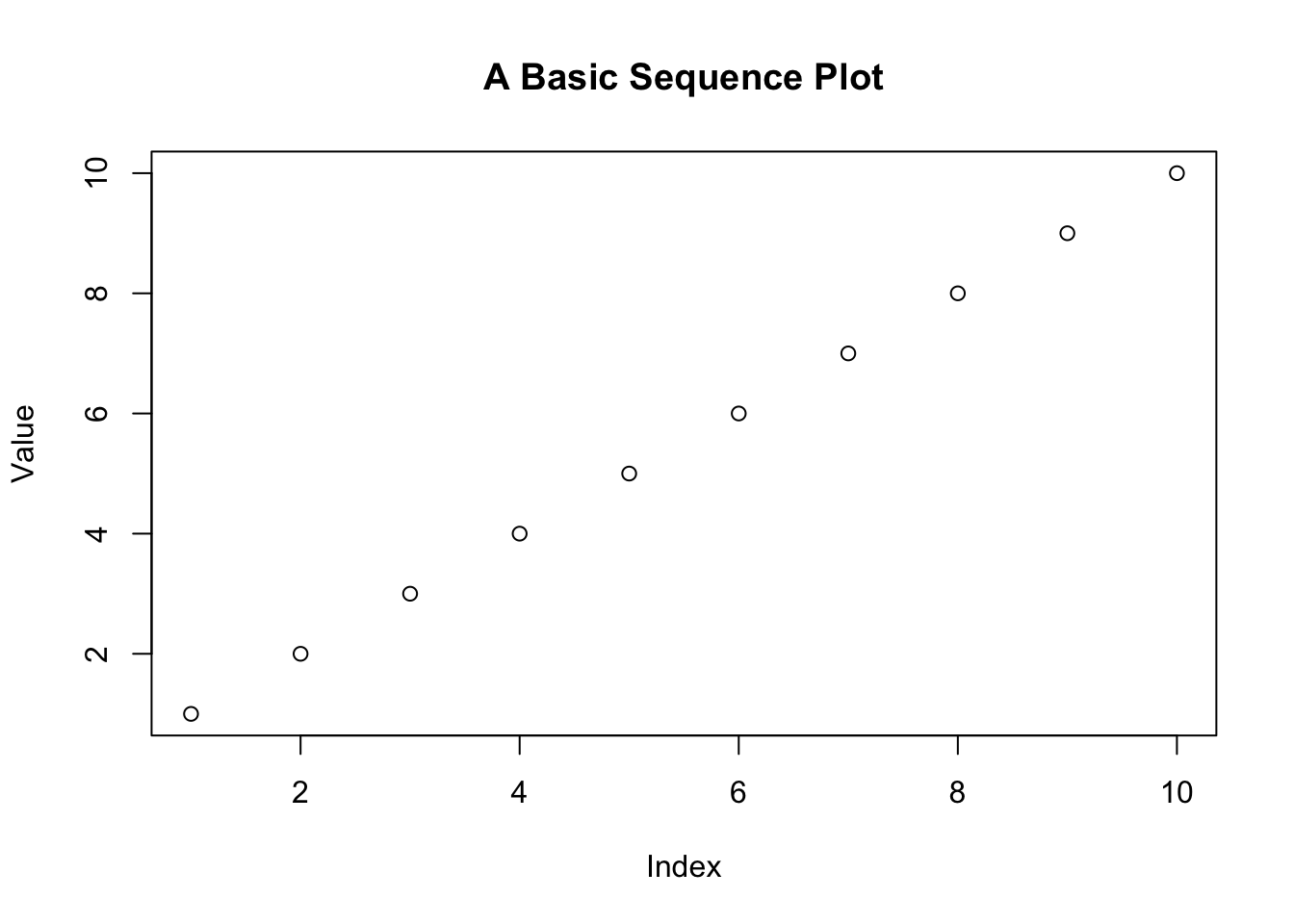 We can easily produce plots with the default plotting package in R. With the plot command, R produces the plot that it thinks it should for the given input. Here, we notice it produces a dot plot.