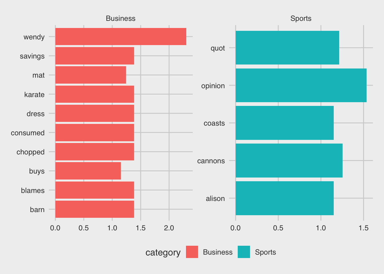 gf_colplots a barplotscales = "free"allows each plot to have independent x and y axiscoord_flipflips the corrdinates so that we get the terms on the y-axis and the tf-idf scores on the x-axis