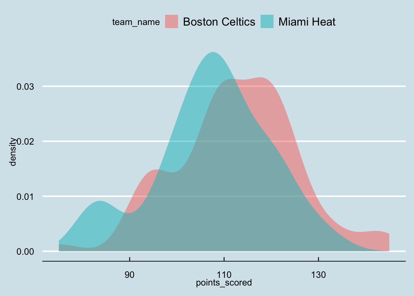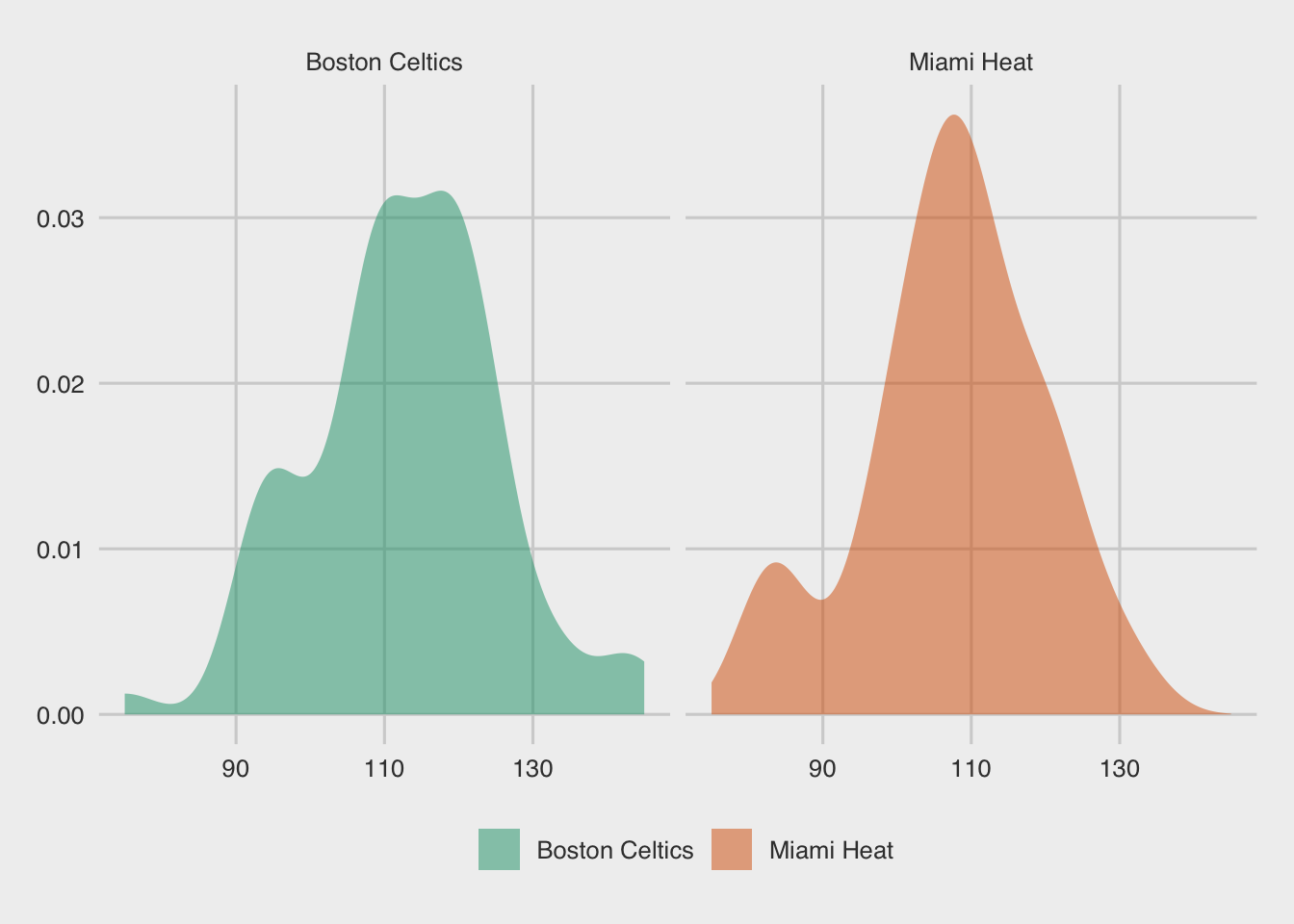 Let’s draw the distributions of points for Boston Celtics and Miami Heat:
