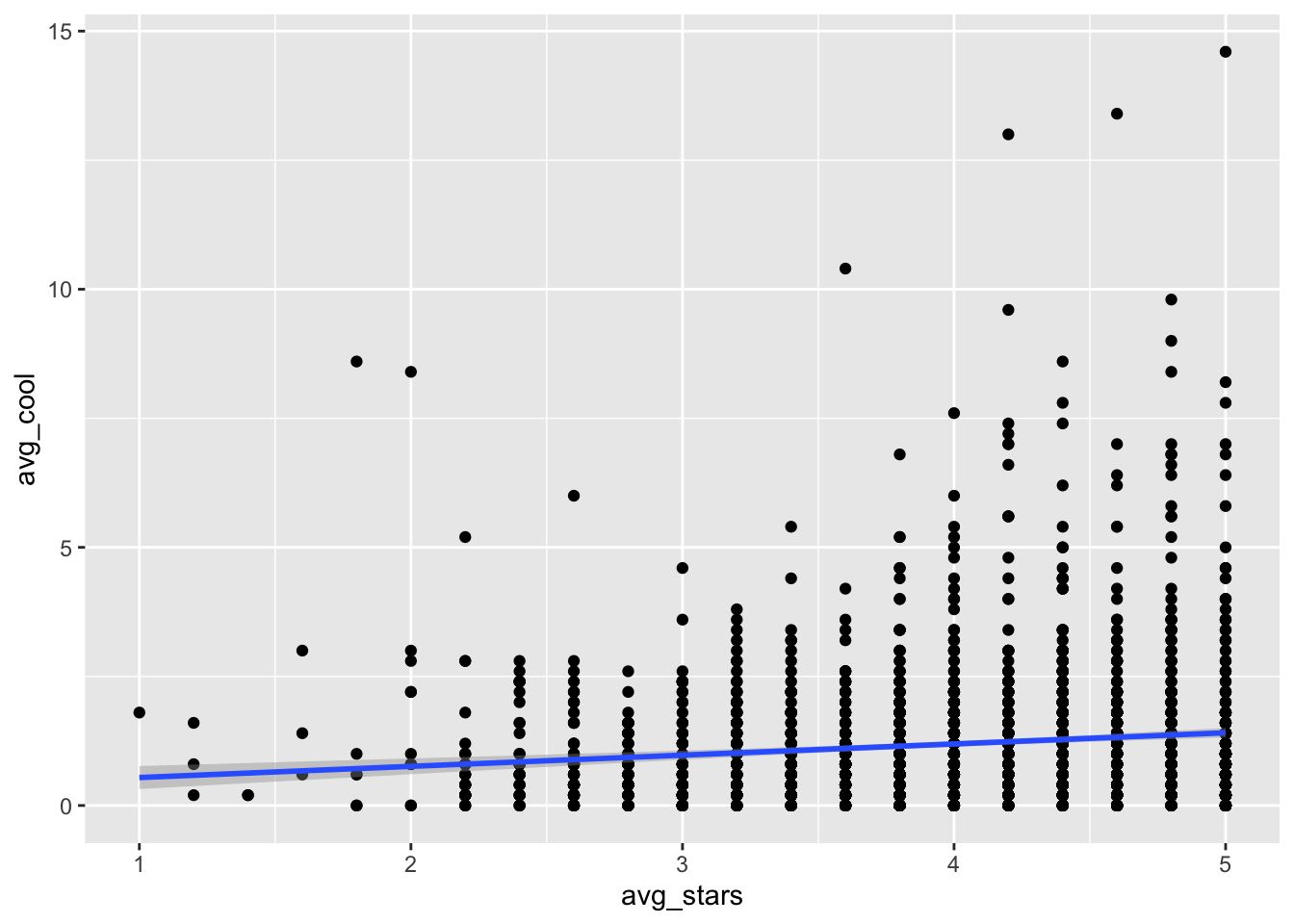 summarize(mean_stars = mean(avg_stars), mean_cool = mean(avg_cool), mean_price = mean(Price.Range))## # A tibble: 4 × 4