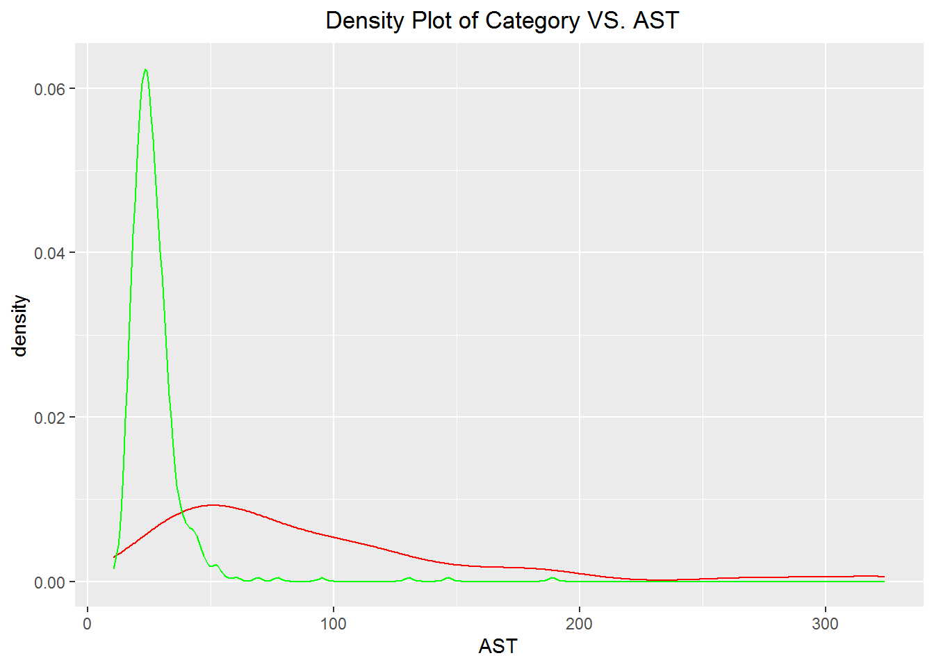 geom_density(aes(x=AST), colour="Green", data=healthyBlood) +