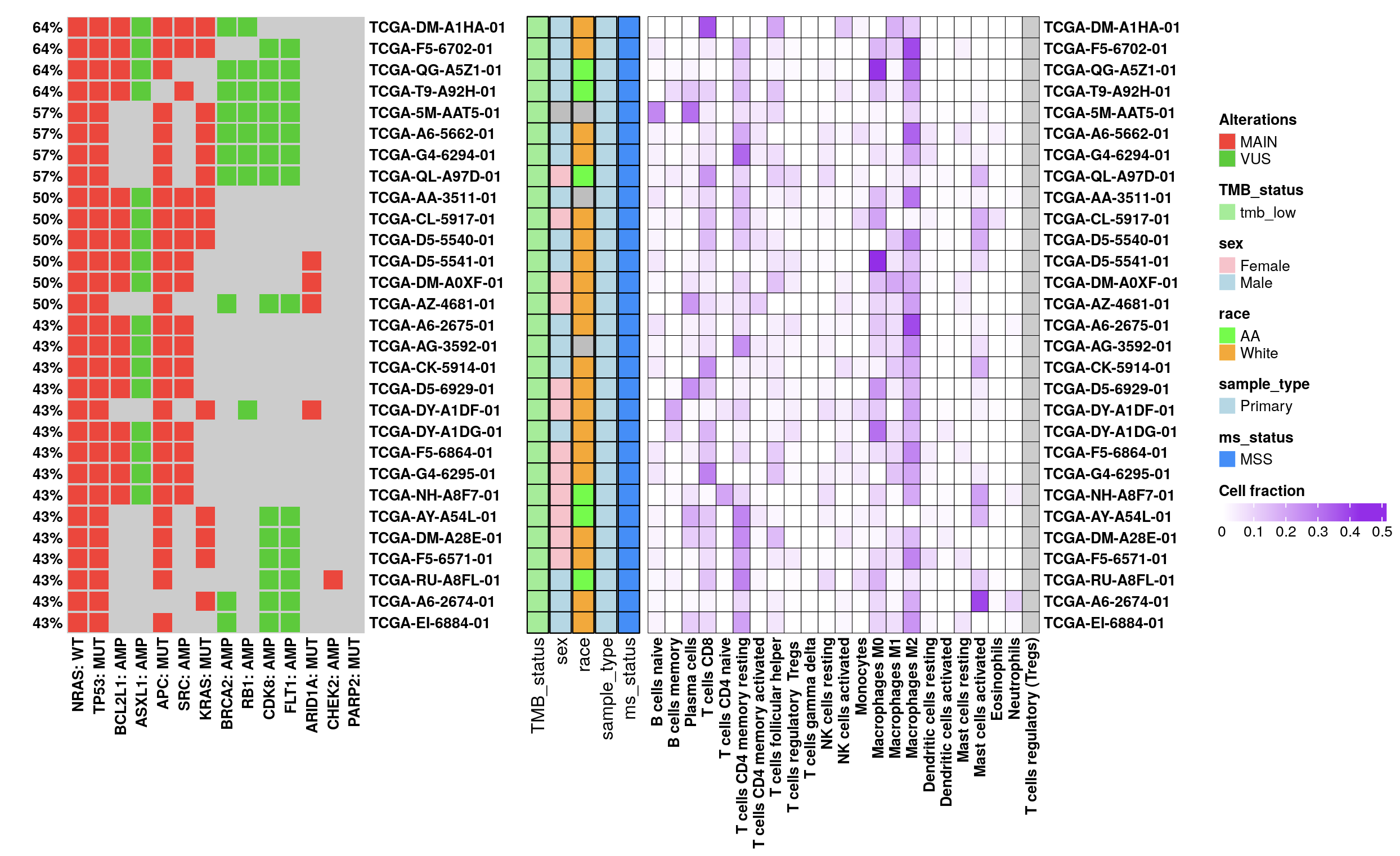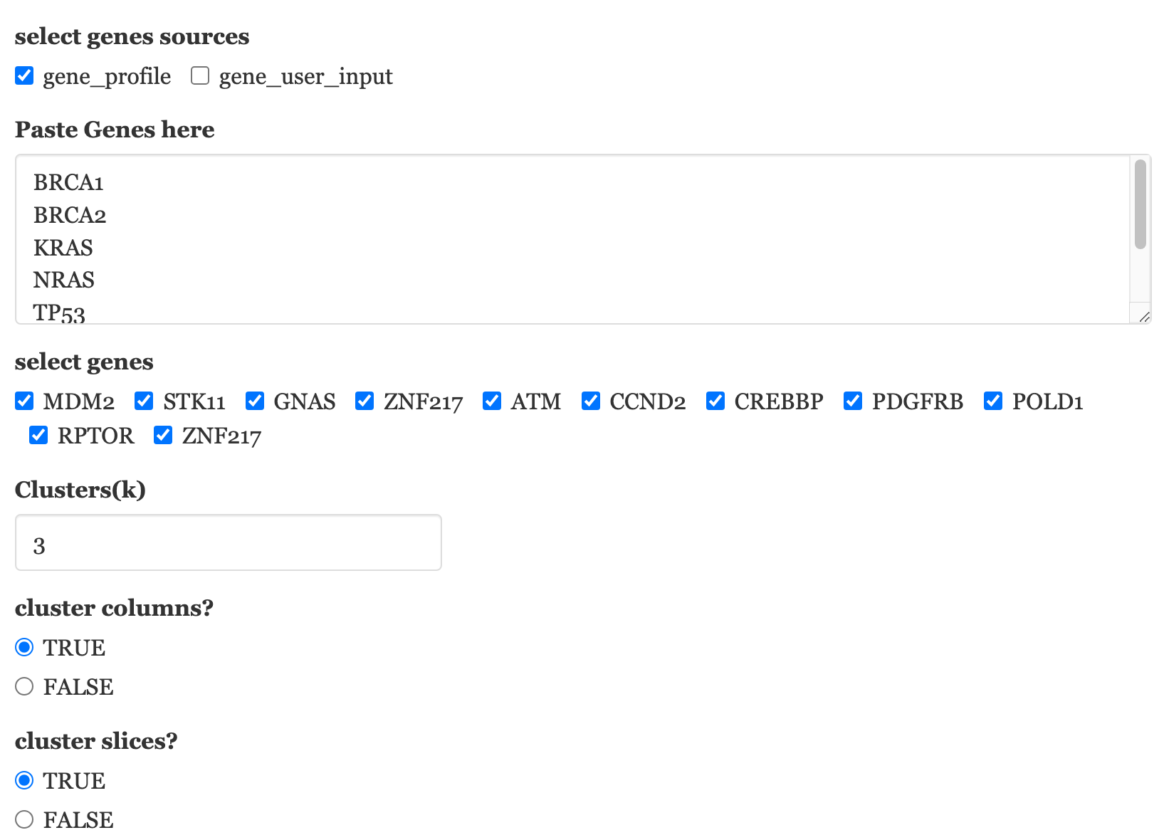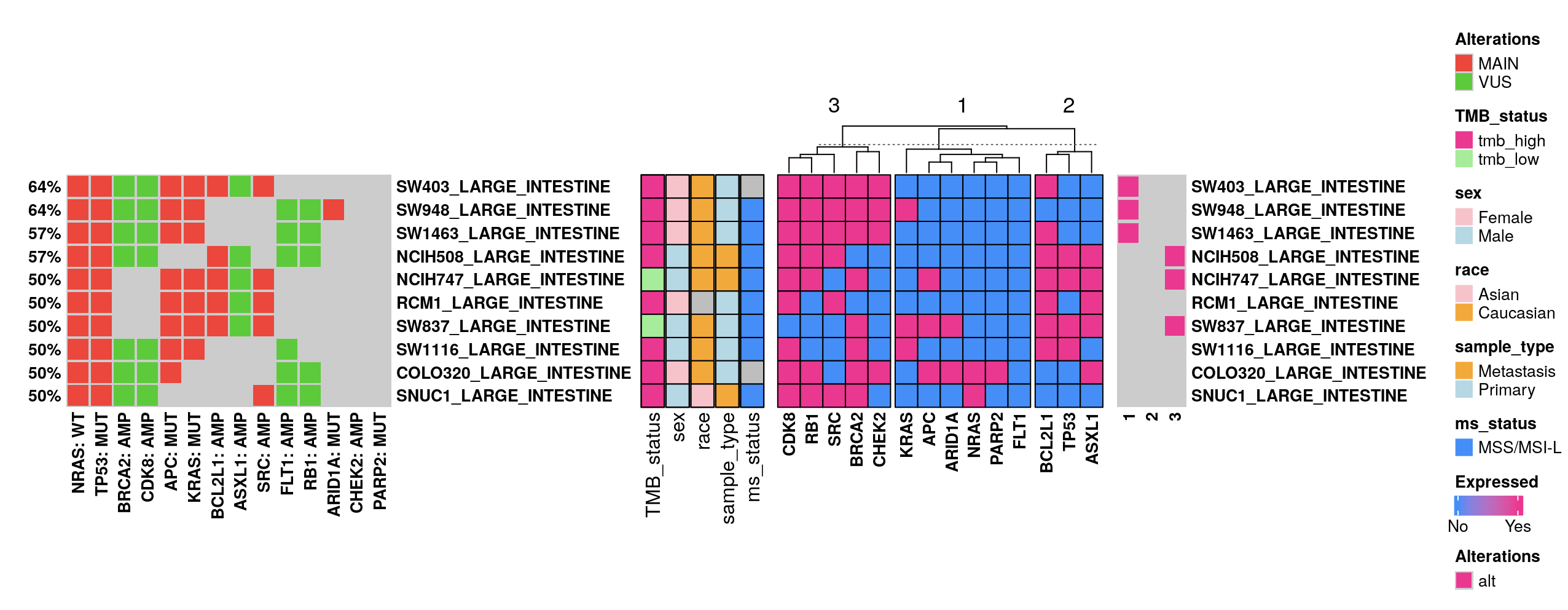 Expression oncoplots enable a comprehensive exploration of RNA expression alongside mutation and copy number data. Supported by TCGA and CCLE databases, this feature draws from the cbioPortal API, with a z-score normalization applied to diploid samples. Here, a z-score above 0 denotes “high” expression, while a z-score of 0 or below indicates “low” expression for each gene.