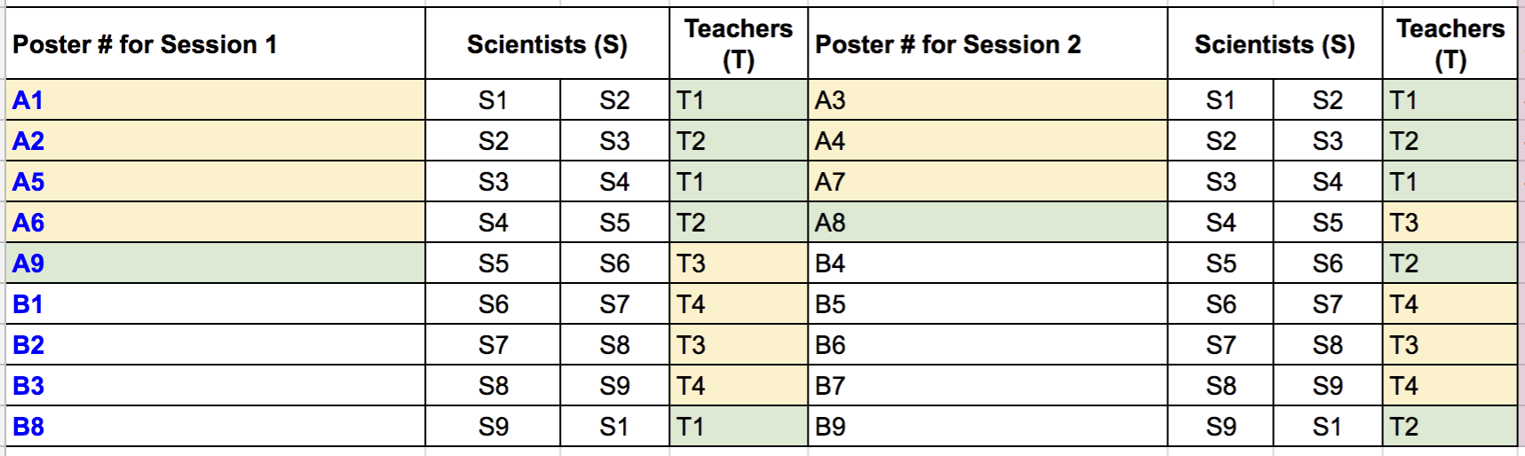 Each investigation project (aka poster name) received an alphanumeric code, A for investigations that would be reviewed by scientists and B for other investigations. Participating educators determined which student investigations they wanted to receive written feedback from participating scientists. The other student groups would receive written feedback from their peers and educators from other schools. Then each scientist received an alphanumeric code (S#) and finally each educator received an alphanumeric code (T#). We use these codes to help build the assignment matrix of investigation projects across scientists and teachers (Fig. 6). We always tried to mix up the investigation assignment groupings among the scientists, meaning that the scientists reviewed posters from different schools. A template for the Investigation Project Assignment Matrix that we use can be accessed here.