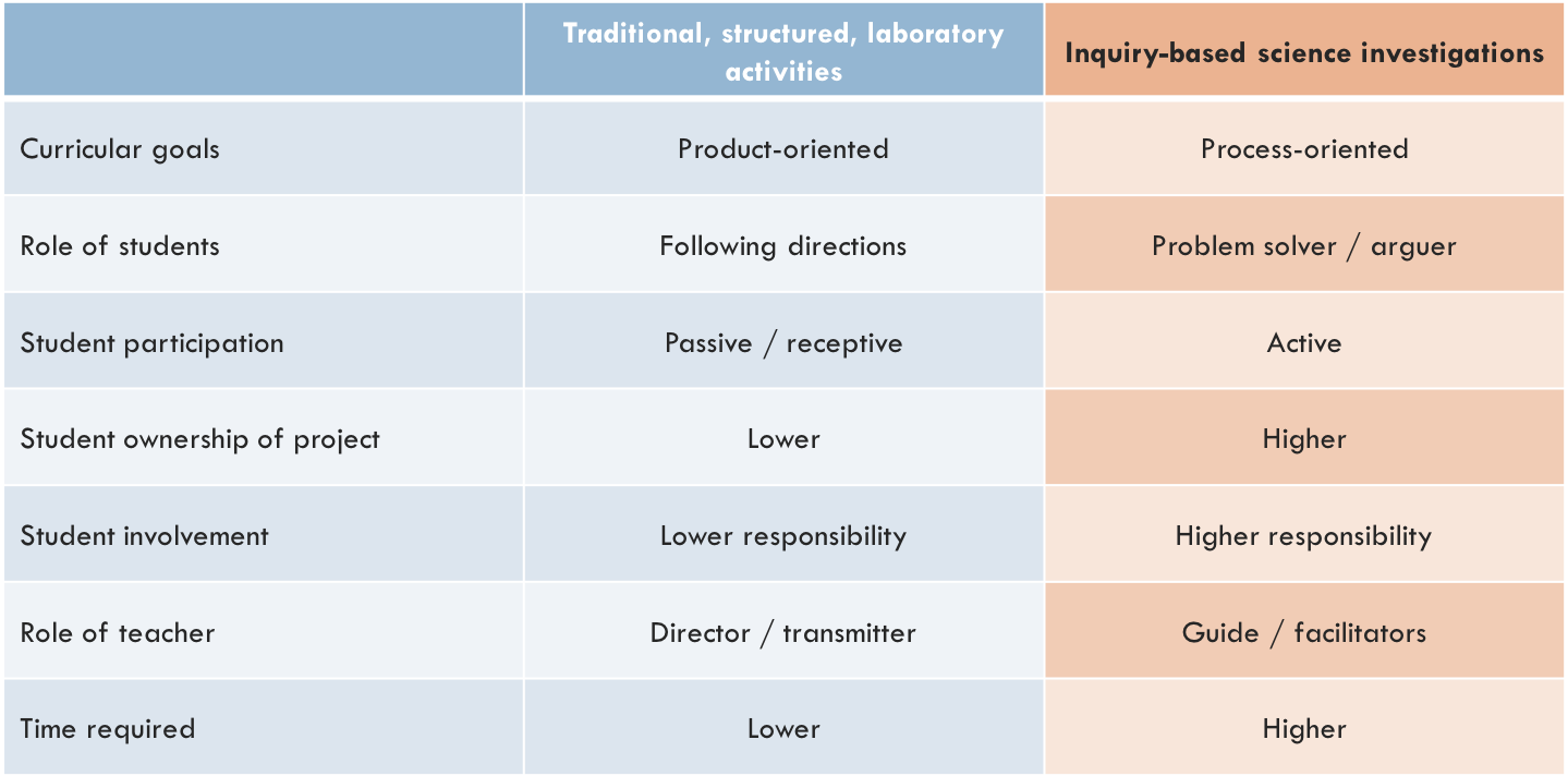 Figure 3. Comparison of science investigations that are traditional, structured laboratory experiences and inquiry-based approaches in terms of approach and structure.