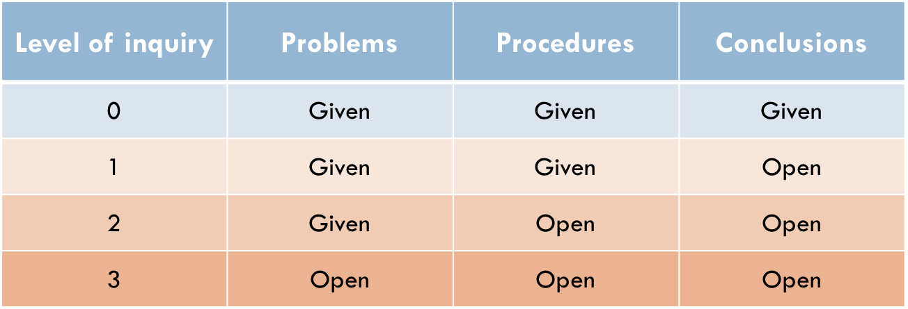 Figure 2. Levels of inquiry in terms of whether the teachers provide the problem, procedures, and conclusions..