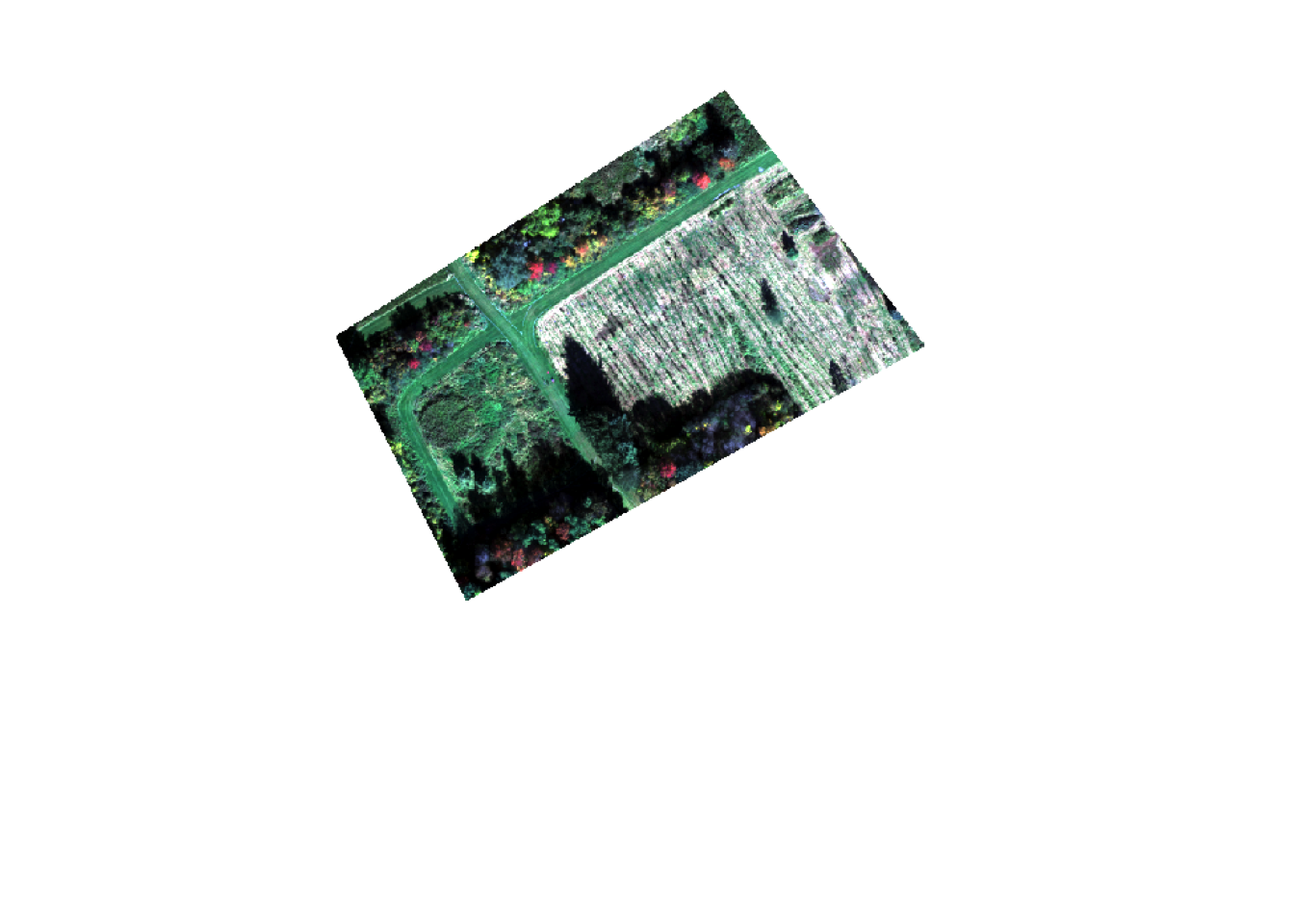 Let’s make a true color plot of the image. Note that R automatically rescales the resolution of each plot to only show 500,000 pixels on your plot. This is a little lower resolution than the actual data. Changing this setting would unnecessarily use computational resources and slow down your work.