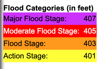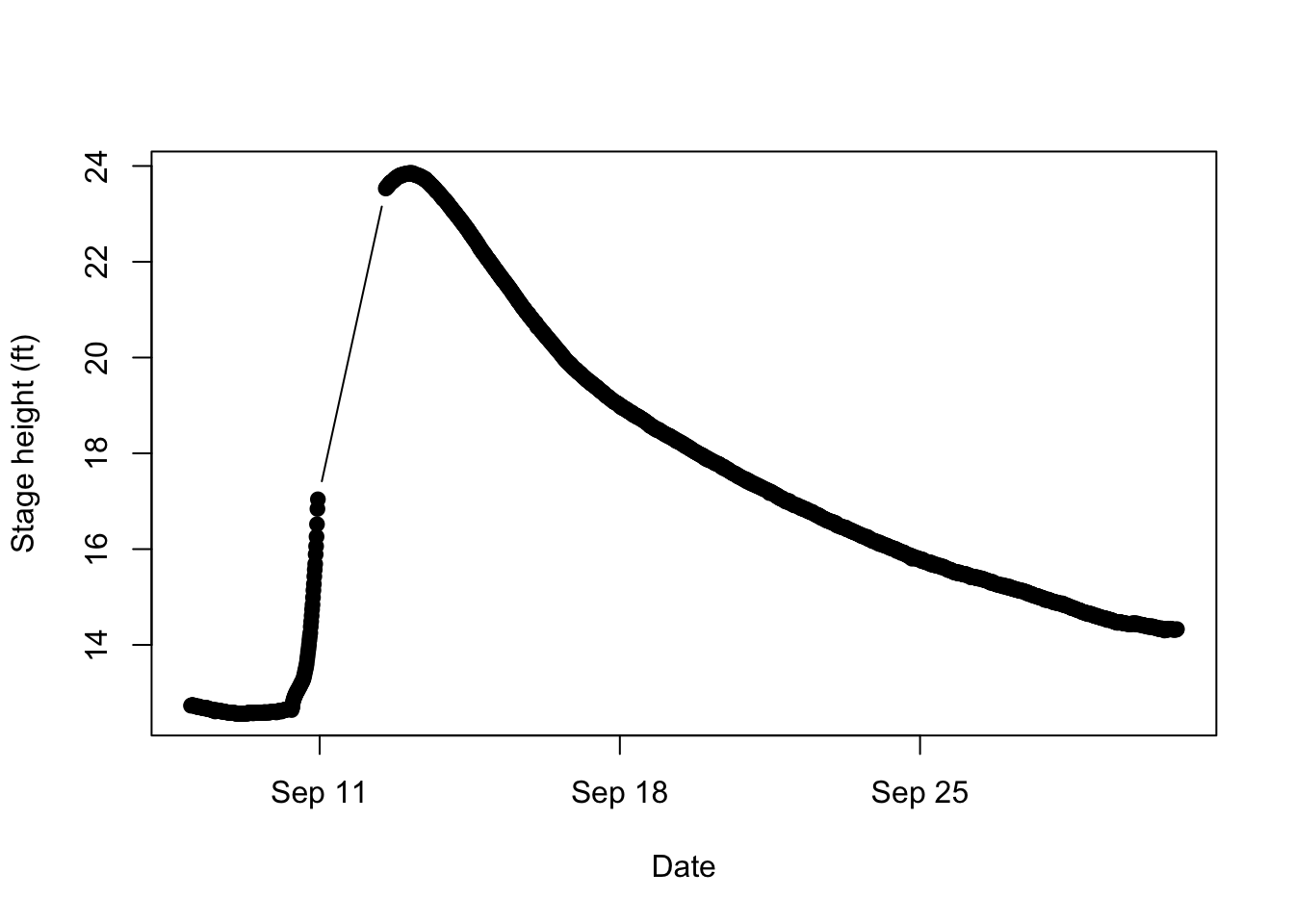 You can see that the river level drastically increased on September 11 and took a while to decline. It might be helpful to bring in the NWS flood categories to understand the scale of the flooding.