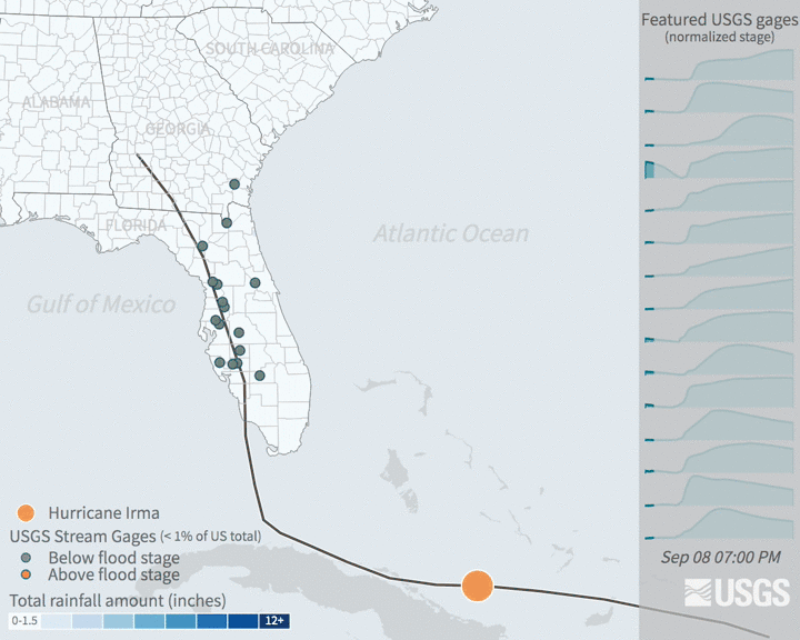 Many damages are associated with flooding that comes with high intensity rainfall and storm surges. Tracking patterns in historical flooding around hurricanes can help enable predictions for future scenarios and evaluate impacts. Real time tracking of stream and river levels is a critical part of the National Weather Service flood predictions and warning system. In this exercise, you will get more familiar with the data that helps track flooding. You will look at data in the days around Hurricane Irma in 2017. Hurricane Irma made landfall over Florida on September 10 and is estimated to have caused $50 billion dollars of damage.