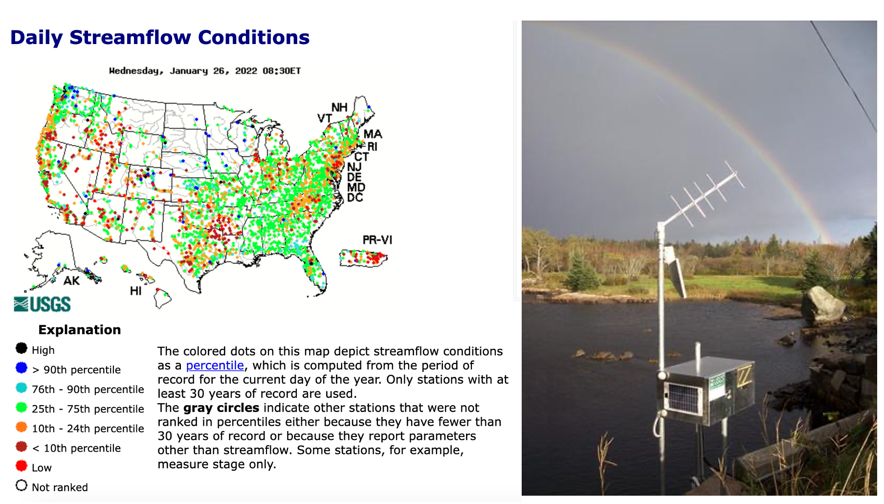 A map of real time stream flow data and (left) example of a sensor set up. Source: USGS water data