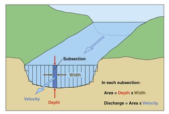 The United States Geological Survey measures stream stage and discharge in 15 minute increments at thousands of locations around the country. More information from the USGS water school. Discharge can be an key part of modeling flooding and understanding issues associated with water cycling in a watershed. The default USGS measurement is in cubic feet per second.
