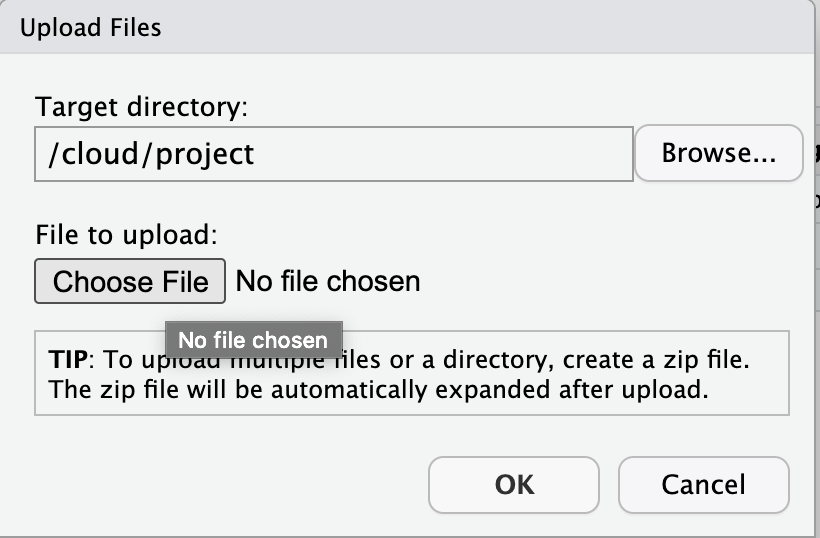 Once you start a new project from GitHub, you can upload data using the upload button. Download the Activity 2 zip file from the tutorials folder. You can upload the zip folder directly into RStudio Cloud from the upload button:
