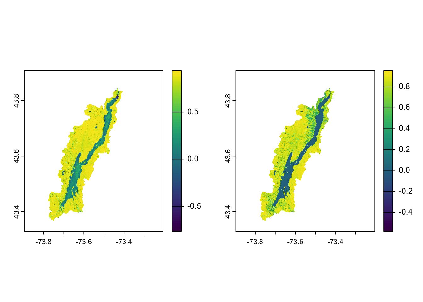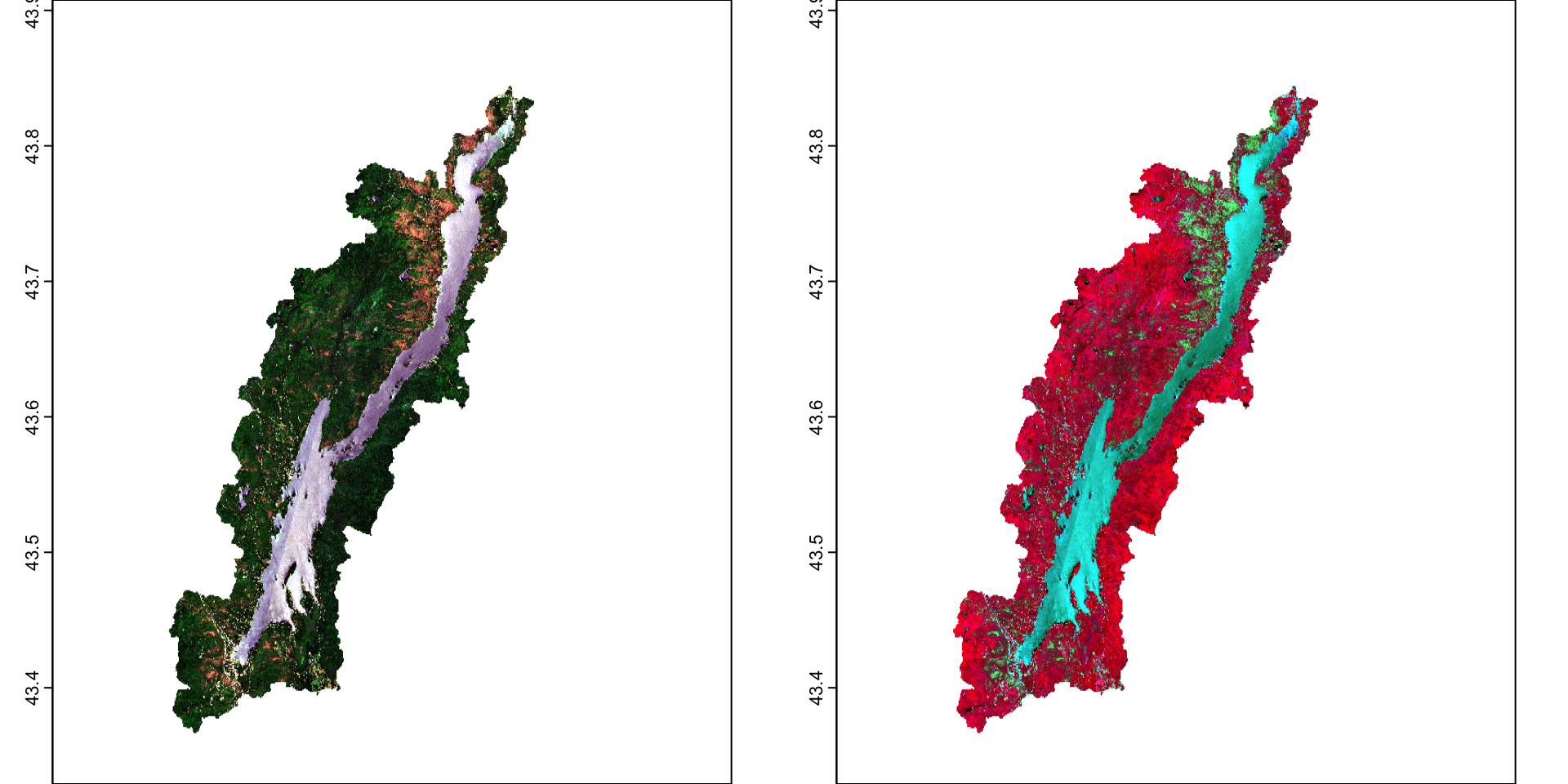 Each image can actually contain multiple images organized in a rast. Here, each tiff file contains four images from each band so you will want to read in the file using the `rast`` function. In the summer of 2021, a major spongy moth outbreak occurred around Lake George in New York State. There is a pre- and post- outbreak image. Let’s read the images in: