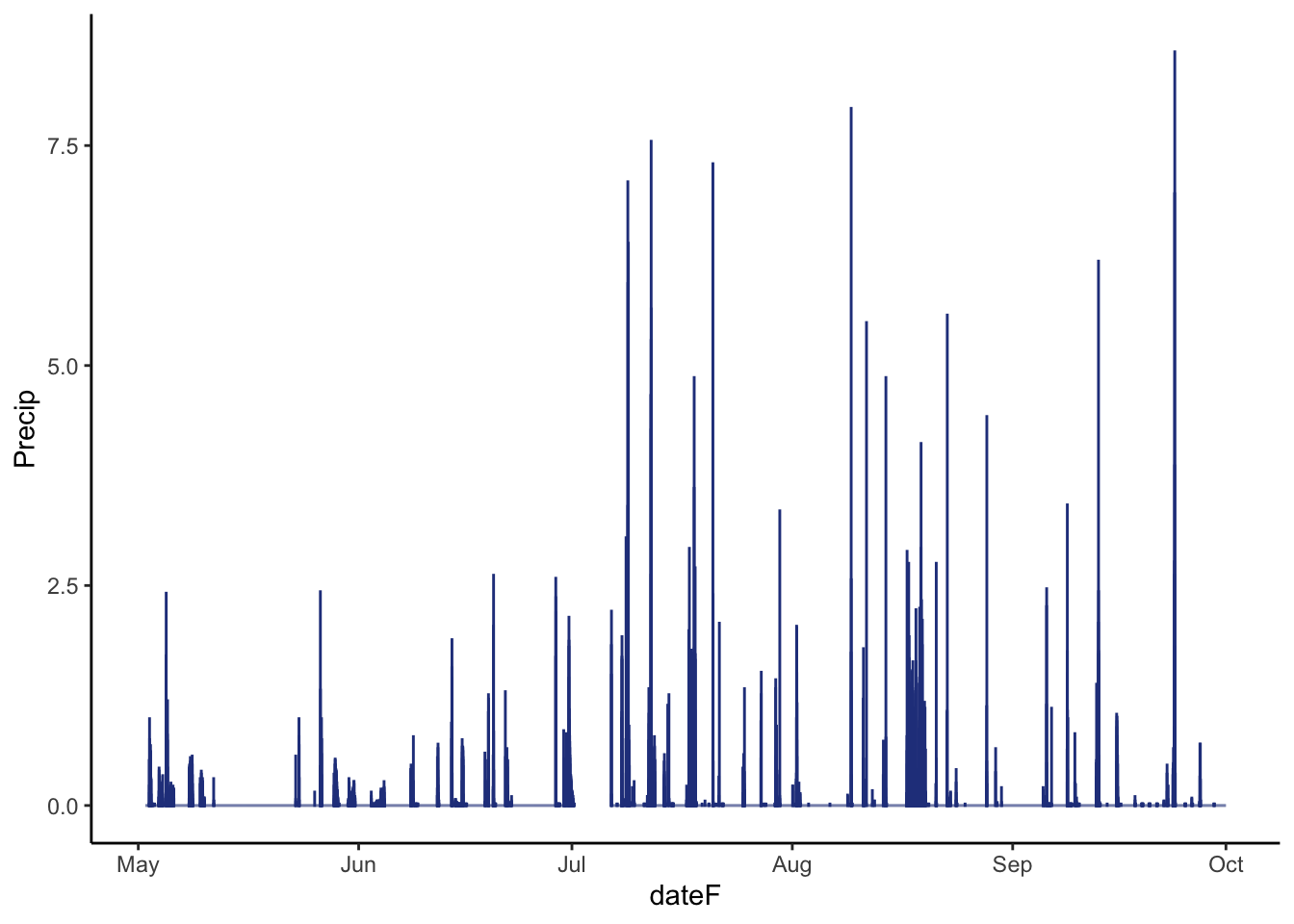 This doesn’t look reassuring. Between the visual assessment of the sensor (I will spare you the picture) and the fact that we don’t see very large (> 3 mm) or trace events in the graph, there is compelling information that the precipitation data was not reliable throughout May and June.
