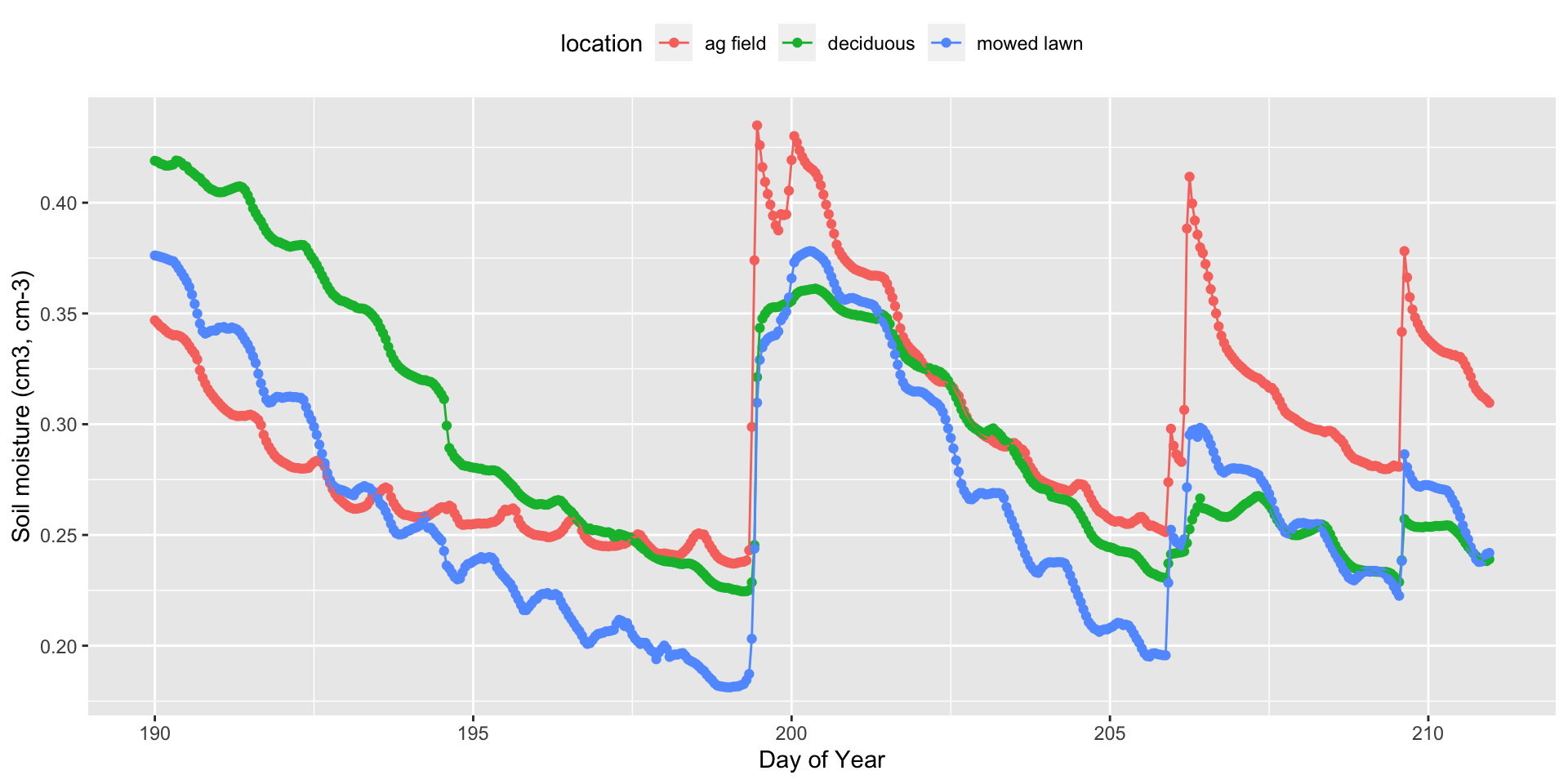 labs(x="Day of Year", y="Soil moisture (cm3, cm-3)")