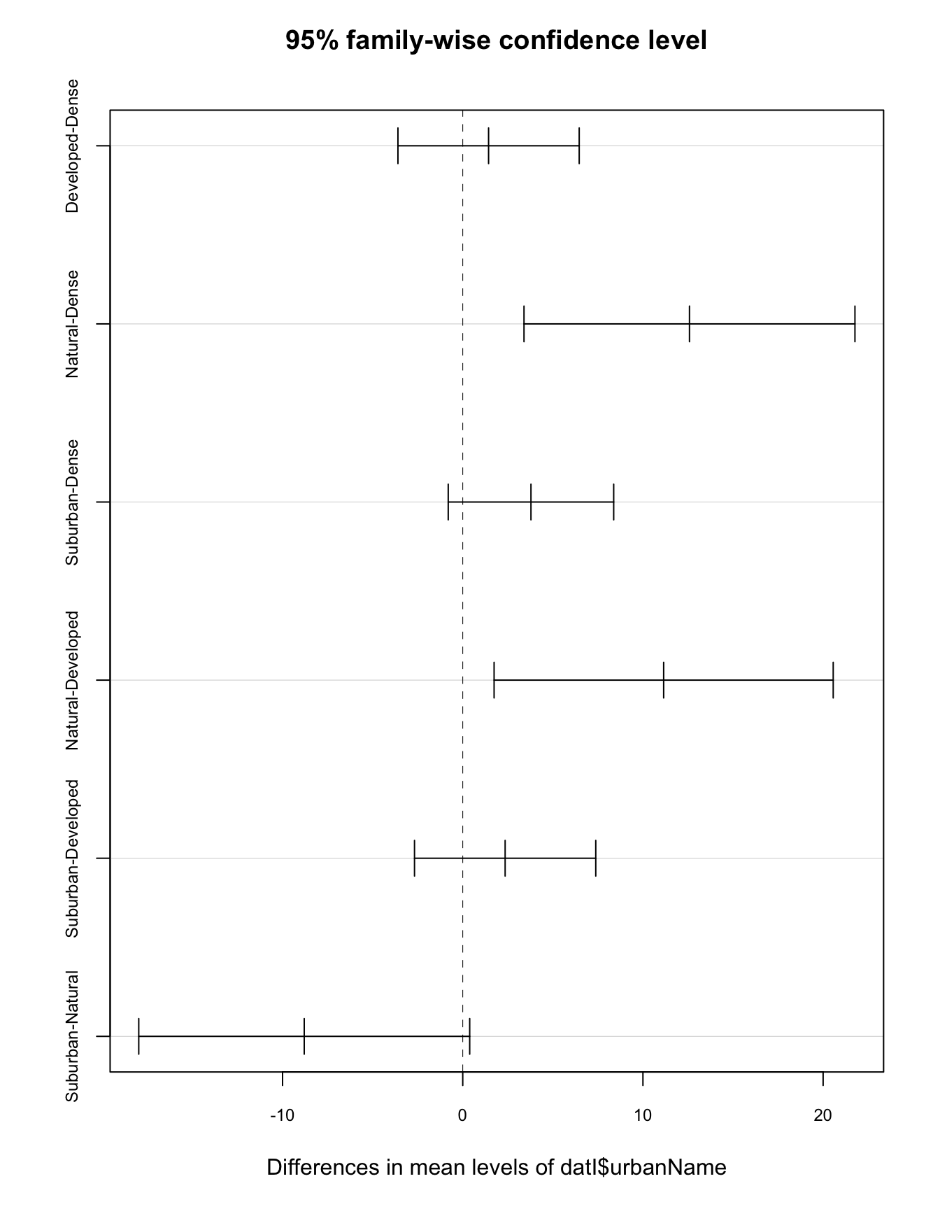 The Tukey HSD results indicate that the Dense, Developed, and Suburban are all similar. Natural differs from Dense and Developed, but not Suburban. Multiple letters can be used for a group. Dense, Developed, and Suburban all get the letter a. Natural will get the letter b. Since Suburban is similar to Natural, it will also get a b.