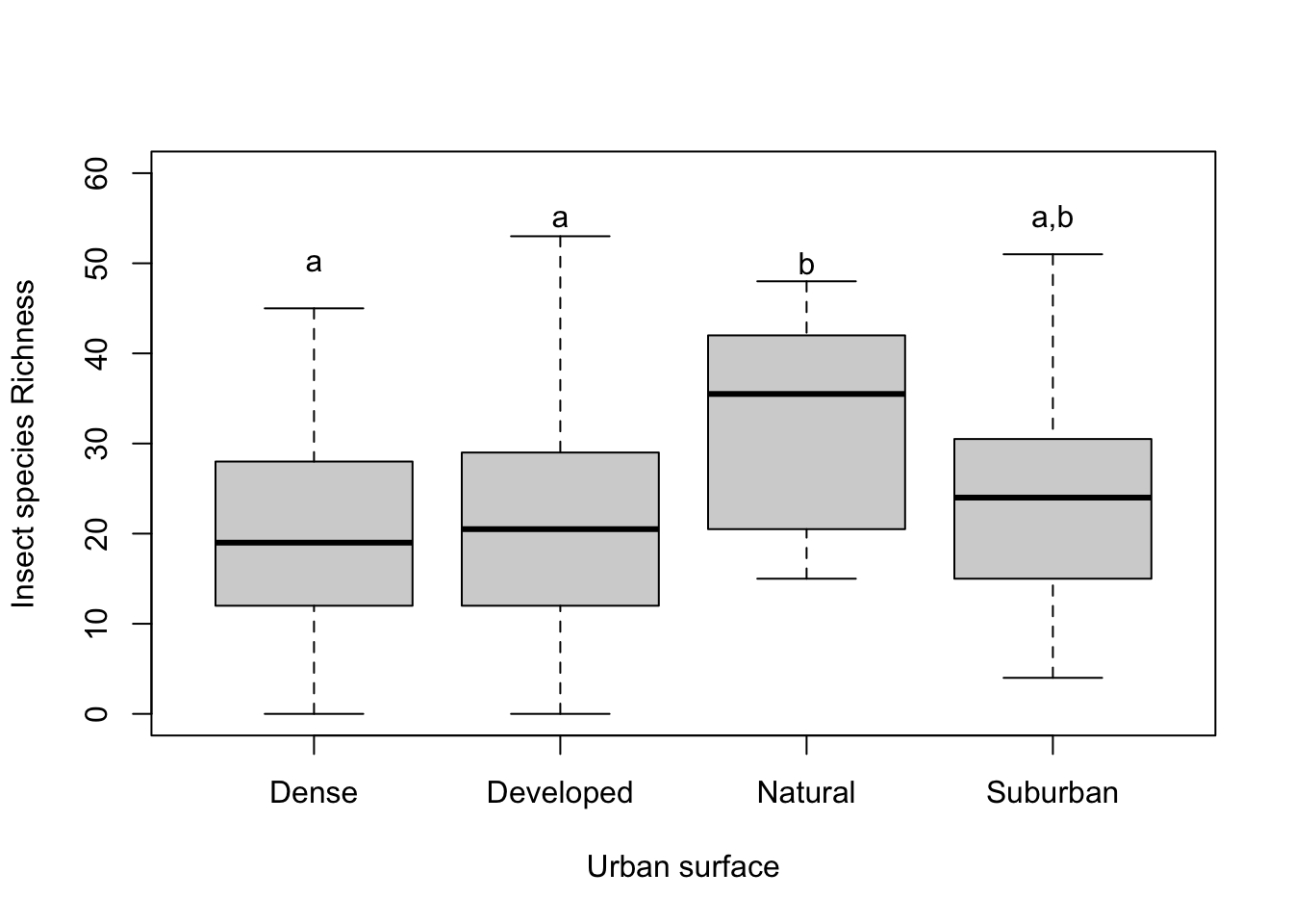 The ANOVA results alone do not give us a complete picture of the differences between urban landcover types. Some groups actually look quite similar. You must check to see how the means compare between groups to make a full statistical conclusion. You would want to highlight that only some groups may differ from each other when drawing conclusions about the urban environment impacts on species richness. This pairwise comparison between groups is called a post hoc test. Tukey’s HSD (Honestly Significant Difference) test can be used to conduct this comparison.There is a simple built in function in R. You just have to give the name of the variable that has the ANOVA results.