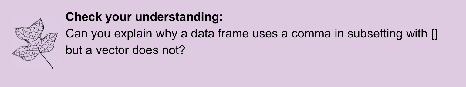 You can subset a data frame using the [] syntax, but you need to account for the two dimensional nature of data frames. If you are taking all observations for a row or column, it can simply be left empty. You can also refer to columns in a data frame in this format: dataframe$columnName: