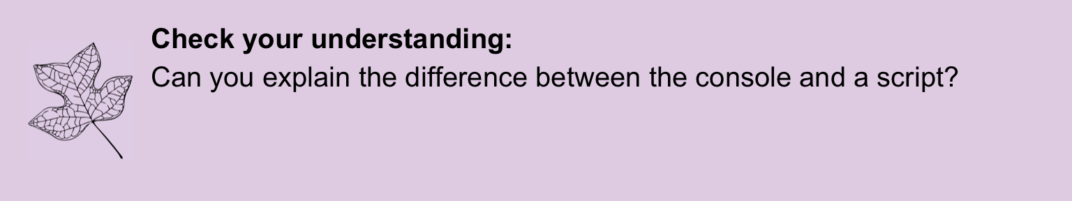 R is essentially a giant calculator with many options for plotting and built in functions for data analysis. The console runs your R code. It’s the calculator! You can type code into the console and it will run. However, you won’t be able to access that code later, just like many calculators. That’s why we use scripts.