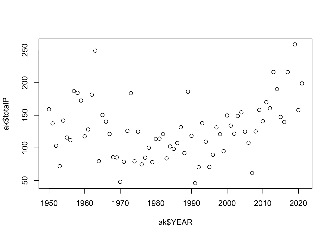 filter(NAME == nameS[3])Let’s start by looking at the basic plot in R using the Alaska data first using the plot function. The basic arguments involve data for the x axis and data for the y axis.