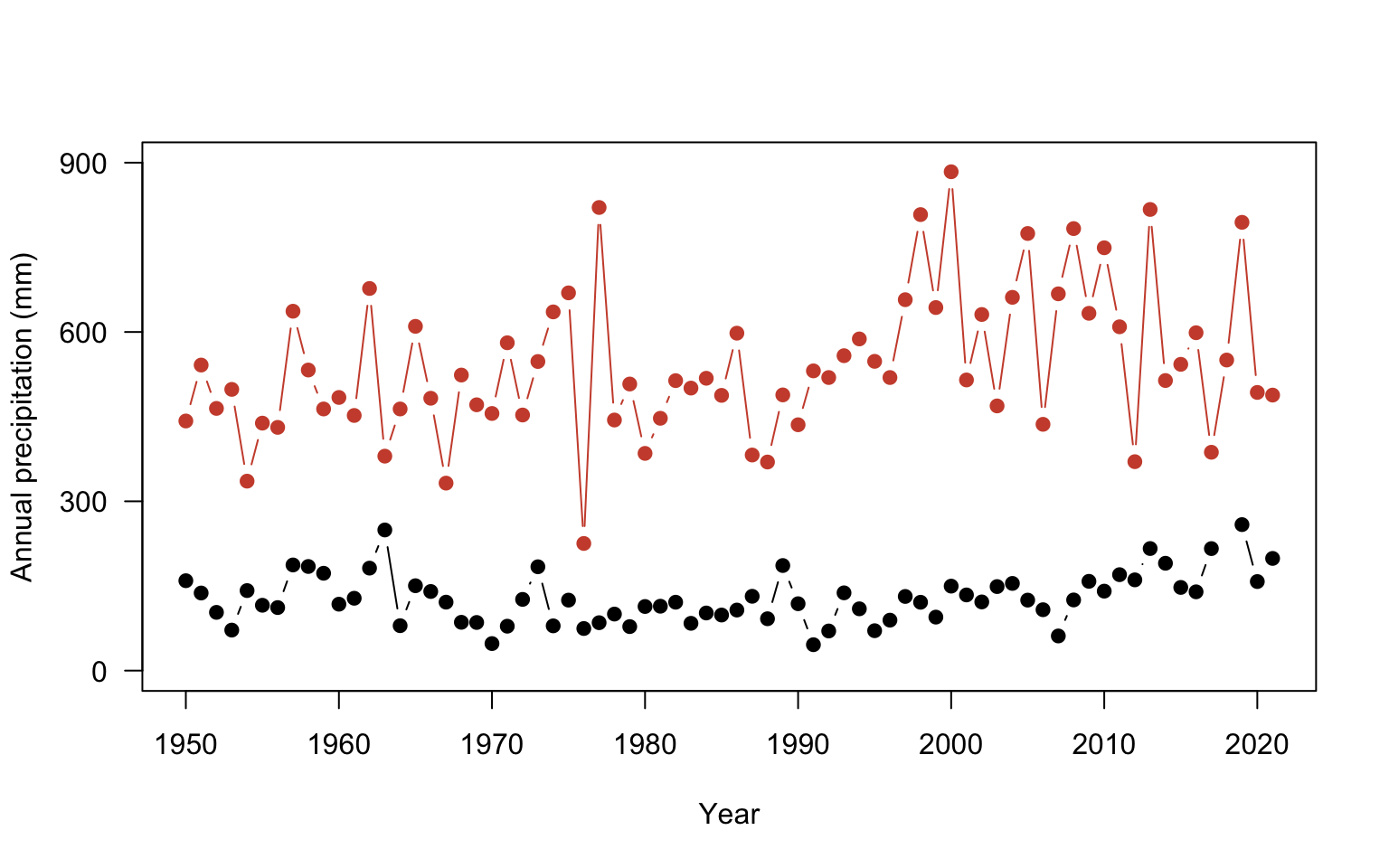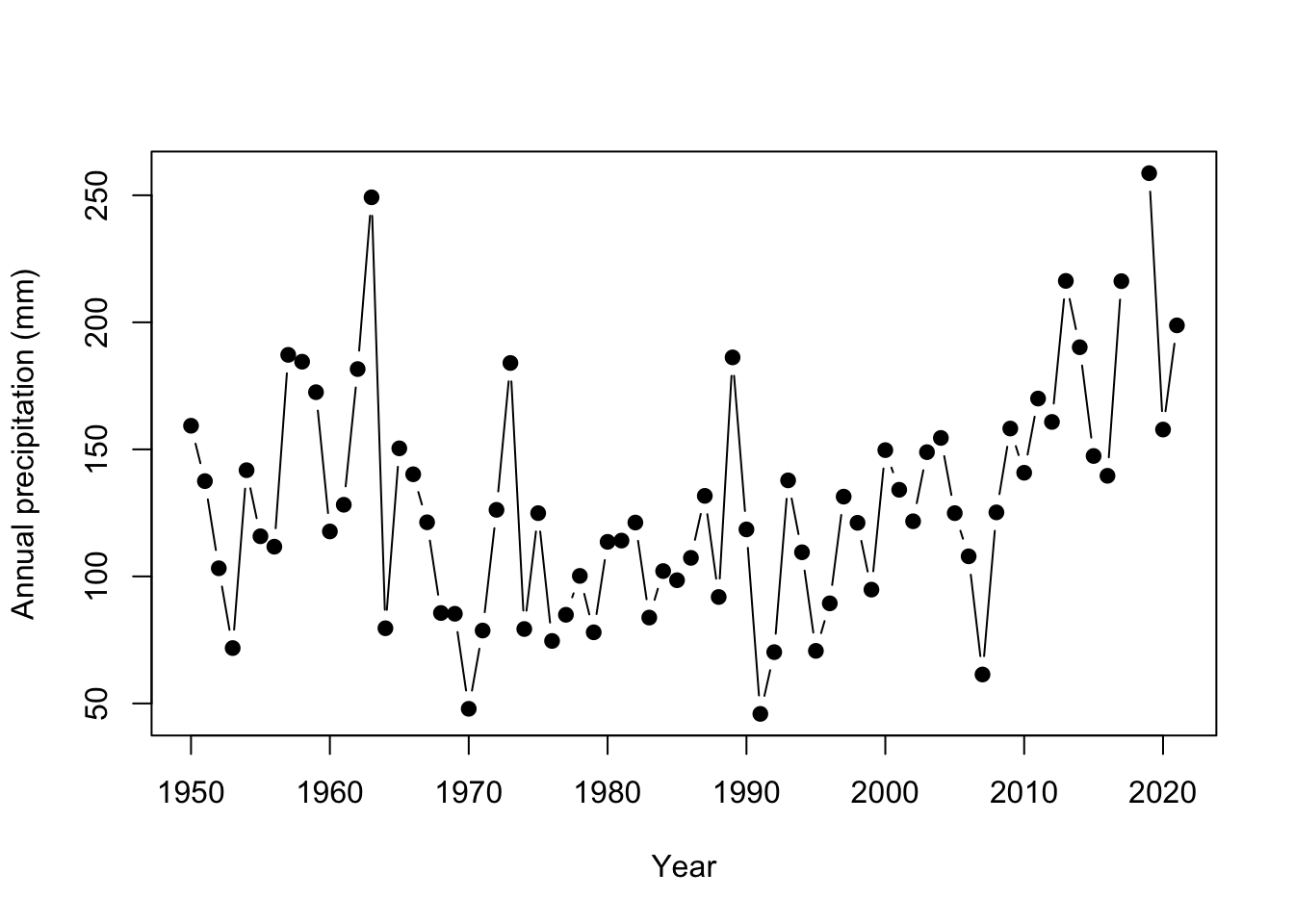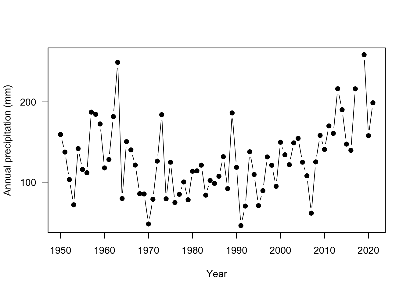 You’ll notice there are a few aspects of this plot that are difficult to read. There are so many years of observations, and it is difficult to track the year to year changes in precipitation. Adding lines can improve the readability of these sequential observations. It is also a good idea to keep the points since some years may be missing observations. With a few arguments the plot can be improved:
