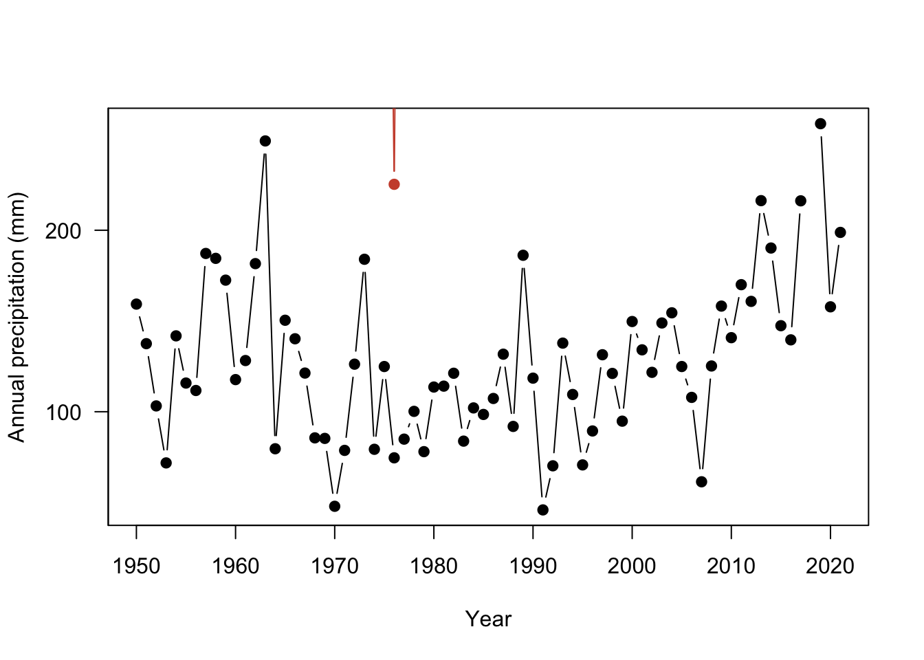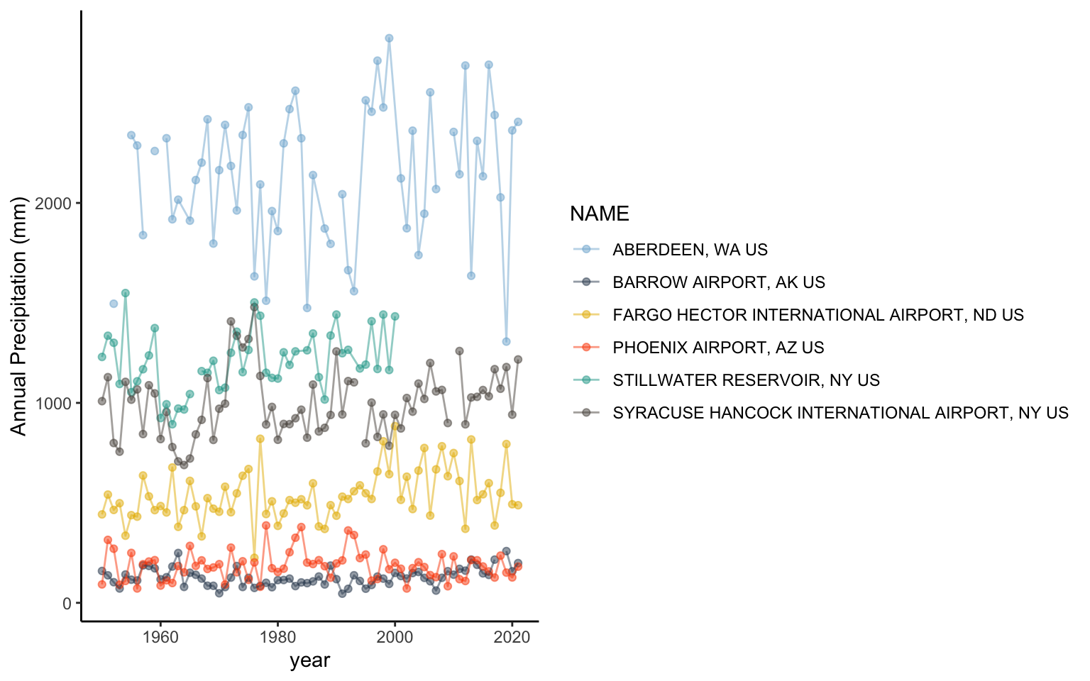 labs(x="year", y="Annual Precipitation") # make axis labelsWarning: Removed 11 rows containing missing values (`geom_point()`).