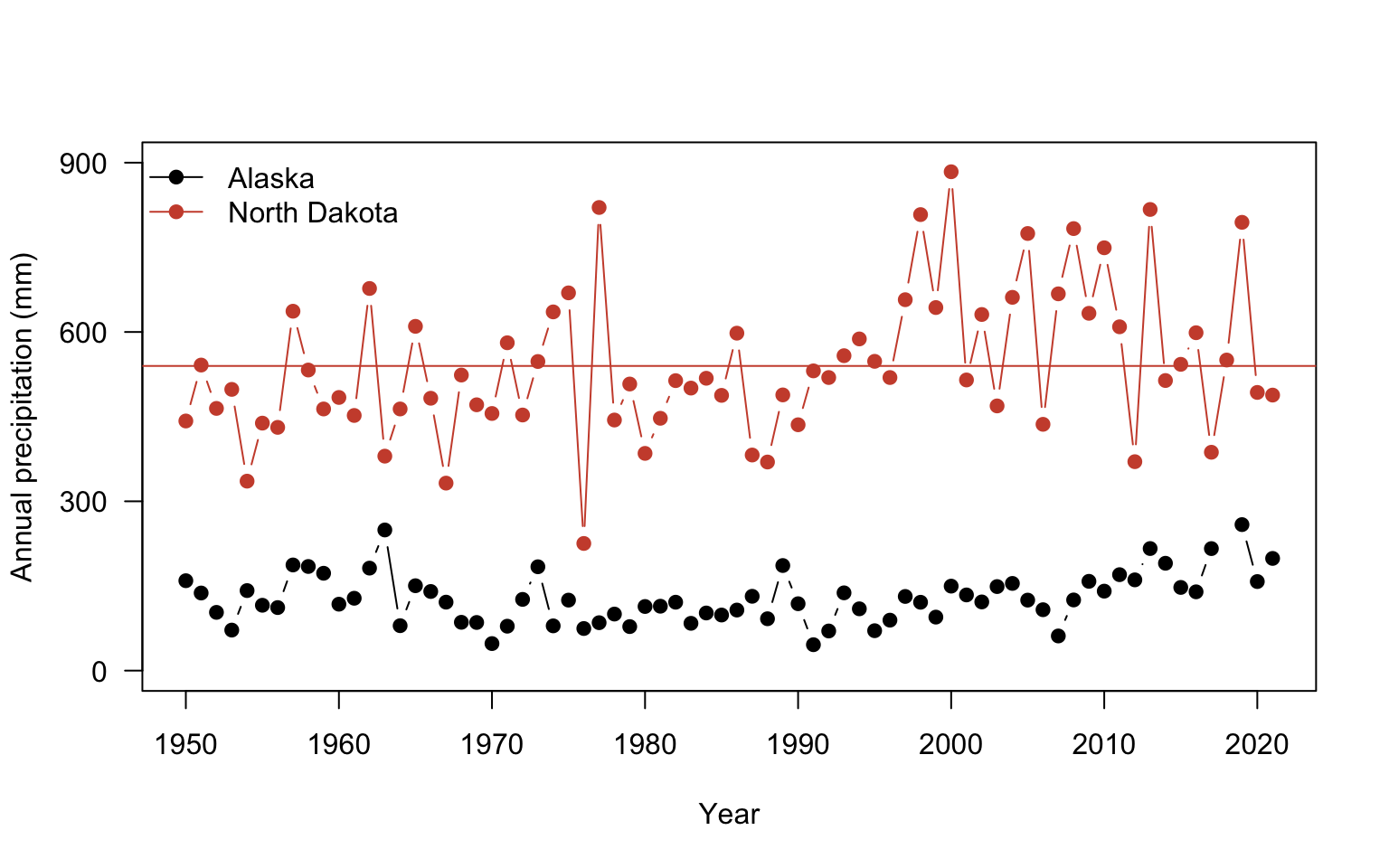 # look at only Utqiagvik (Barrow, AK) and Fargo, ND annual precipitation