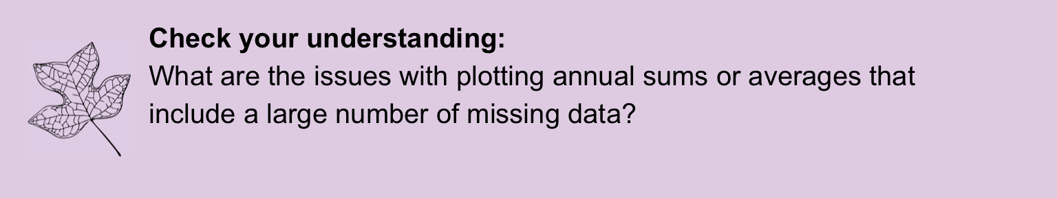 Let’s start by taking a closer look at precipitation at each site. Just as you did in the previous chapter, totaling the precipitation that occurred in a year using the summarise and group_by function and sum will allow you to examine total annual precipitation. However, you want to avoid years with too many missing observations. In most cases involving missing observations, annual precipitation will be biased lower than the actual values of precipitation that fell.