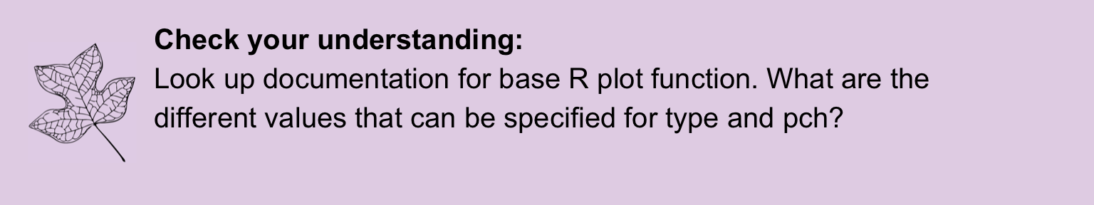 You’ll also note that some of the y axis ticks are cut off because the plot window is too small and the labels are flipped in a hard to read direction. R doesn’t offer a lot of axes arguments within the plot function, but we can turn them off and add them separately with the axis function. You can turn all axes off in plot using the axes=FALSE argument or individual axis off. In this case, the x axis looks good so need to change it. yaxt = "n" turns off just the y axis.