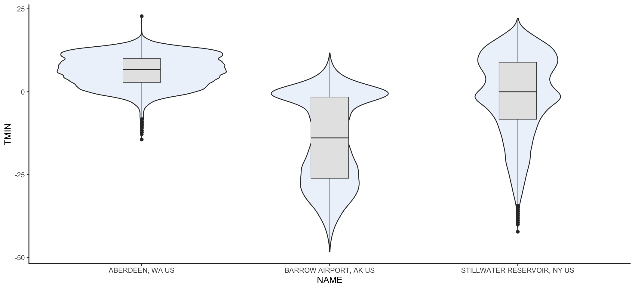 Let’s take a look at the daily minimum temperatures in Alaska, Washington, and Stillwater Reservoir using a violin plot: