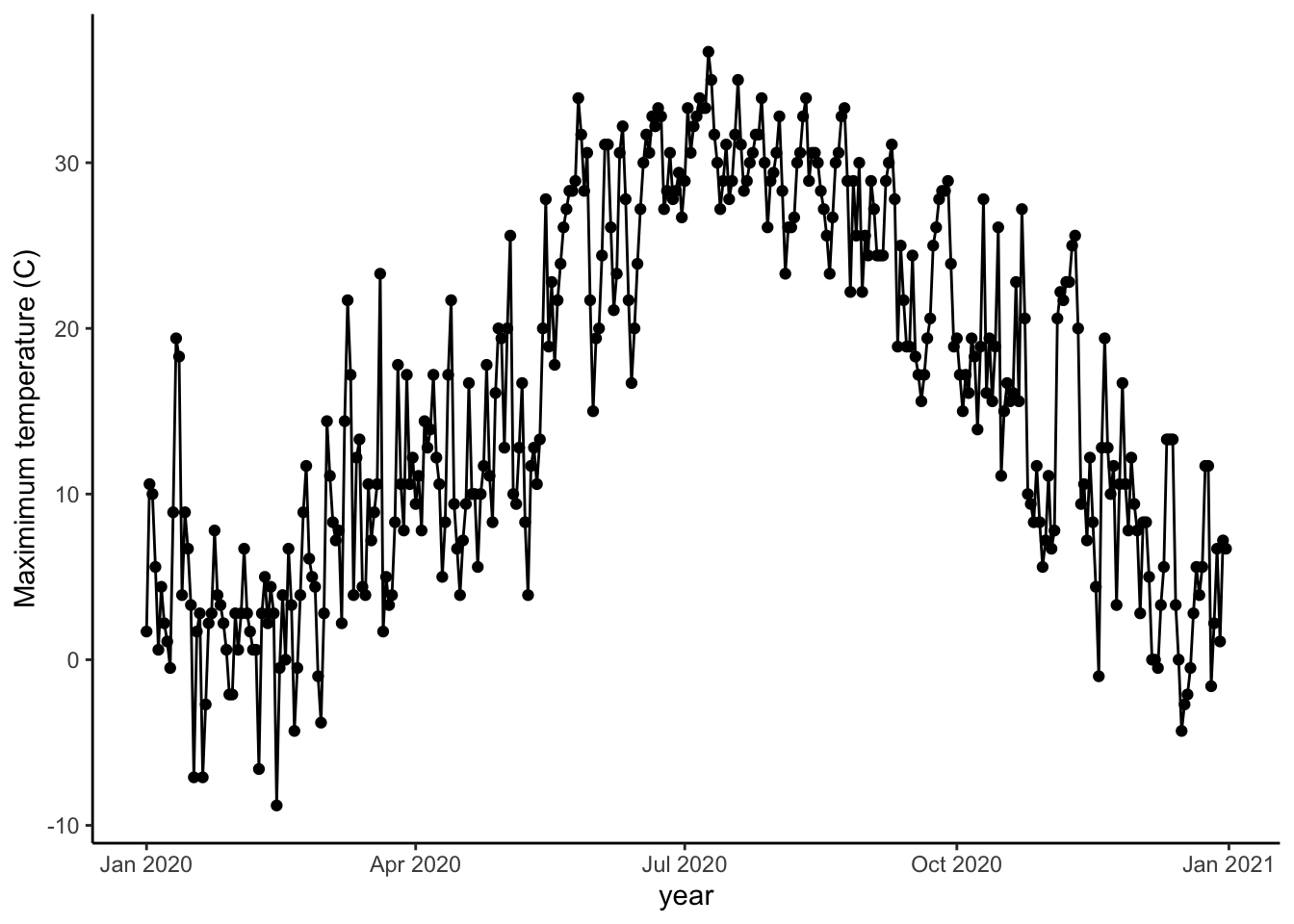 Let’s wrap up by looking at one other component of plotting that will be useful. Let’s take a closer look at daily patterns within a year in Syracuse NY in 2020.