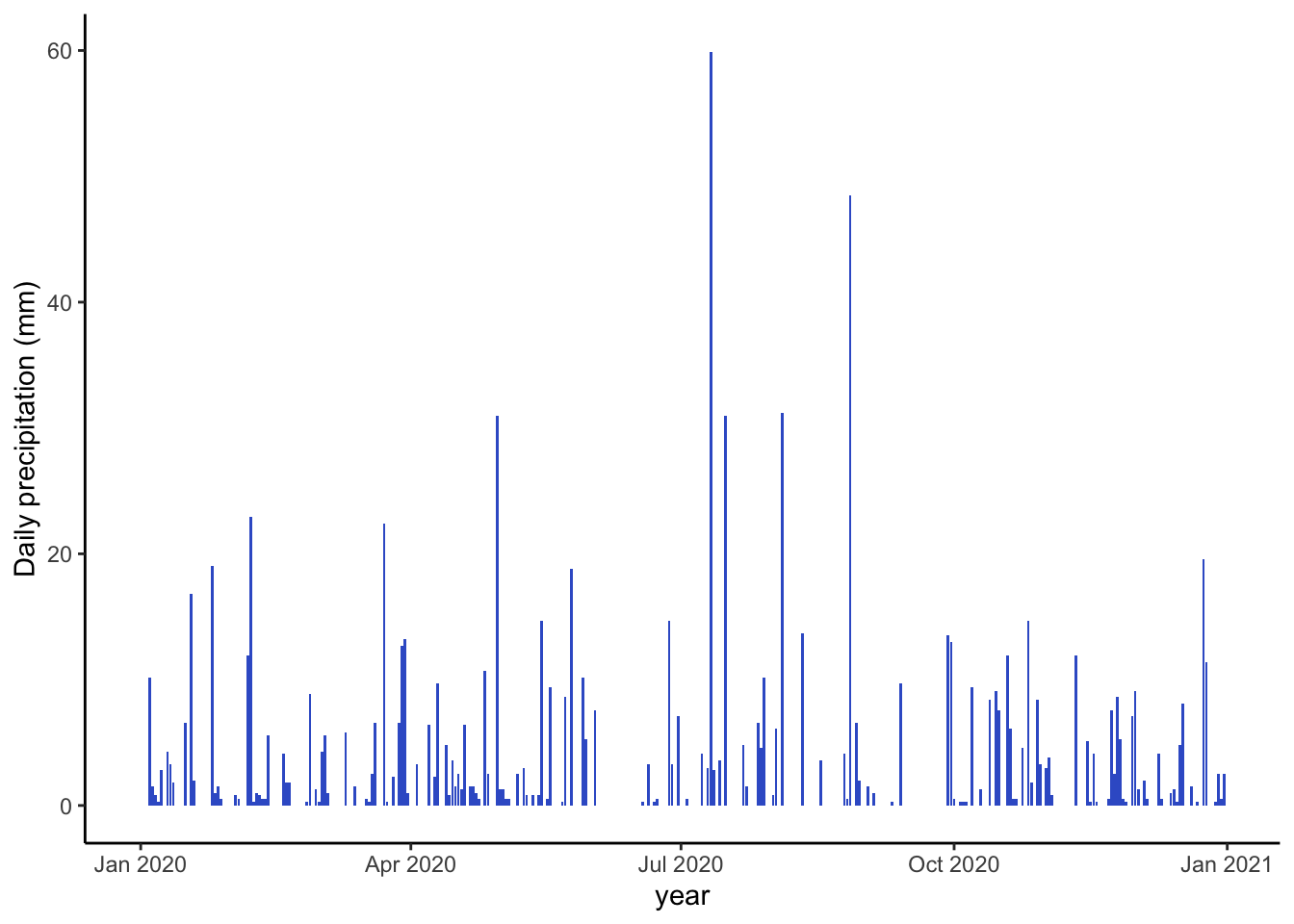 Barplots are helpful for precipitation since we are often looking at totals for a day or year and in any cases where there is no variability associated with each value.