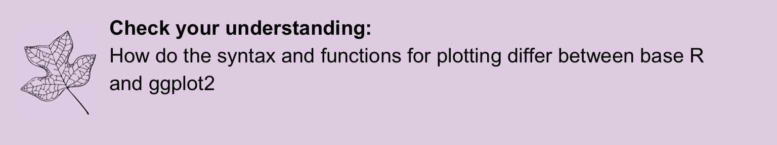 ggplot2 contains many different functions to make nice looking plots easily. You’ll notice we needed to run many lines of code to make the axes and points look nice. ggplot2 has developed a different plotting syntax than base R. The language of ggplot2 means that you declare the data that you are using, the coordinate system, and the geometry to be used in the plot. The data refers to the data source and the aesthetics. In the aesthetics, you define the x, y coordinate specifications and any other information on the size or colors to be used. The coordinate system specifies how to plot the data graphically. By default it refers to a cartesian coordinate system which simply means plotting on a x,y axis. The geometry refers to the shapes/type of plot to be used (ex: bars, boxes, points). You can find a cheat sheet for ggplot2 here: https://github.com/rstudio/cheatsheets/blob/master/data-visualization-2.1.pdf