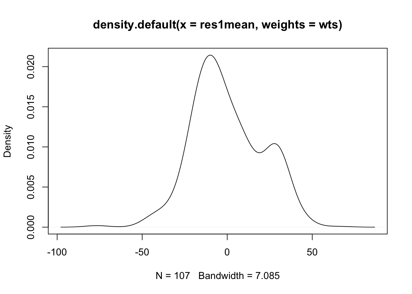 - If you used STATA, and egen, you would see a bimodialty in this plot, as the mean is assigned to every student in that school. If we wish to weight by the number of students sampled in each school, we could do it in several ways in R, but let’s try using the weights option of the density function.