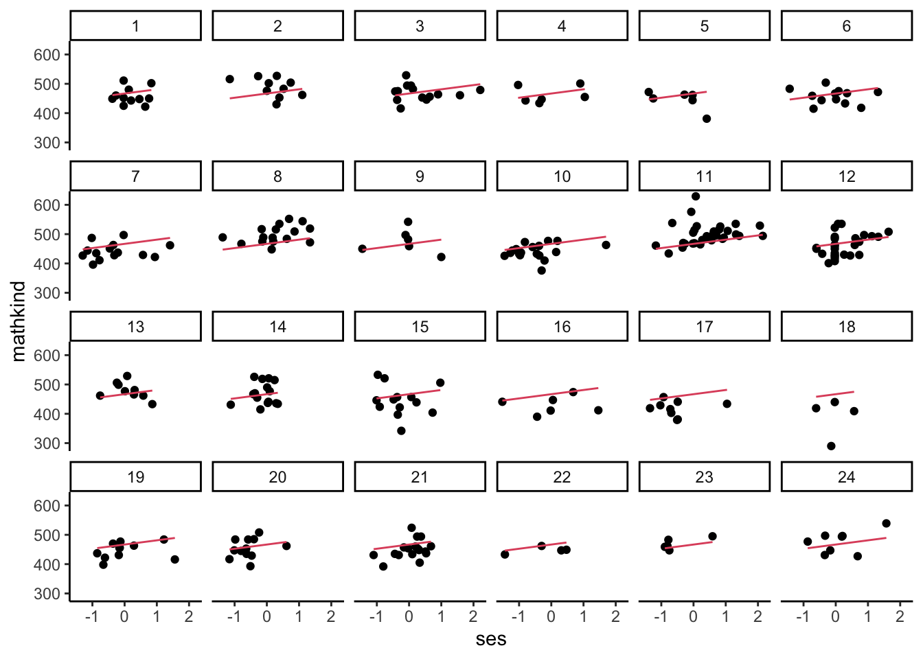 - Below, we run a simple OLS regression of MATHKIND on SES, generate the regression line (using a predict command), and then plot the raw observations against the common, or pooled, regression line for the first 24 schools to show that some seem to have residuals typically above or below the regression line.