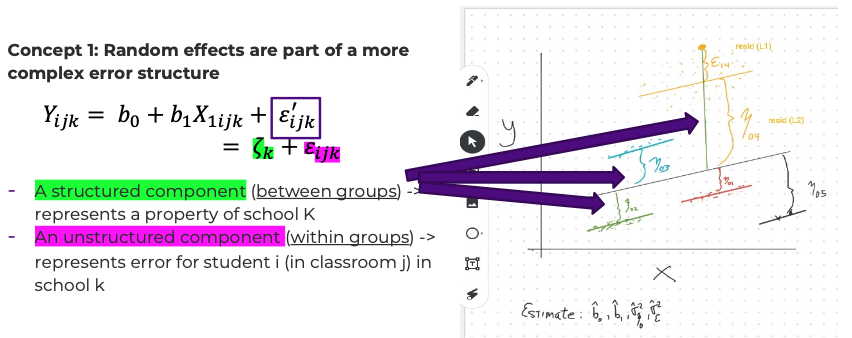 - Identification: we can learn about \(\zeta_k\) for a specific school k, and identify the effect, by looking for systematic, mean differences in level for all students in that school. HERE IS A WAY TO CONCEPTUALIZE THIS: Imagine that you ran OLS regression on your outcome, ignoring the nested nature of your data. If, for some schools, the structured error terms \(\{\varepsilon_{ijk}'\}_{\cdot k}\) (there are many of these; this is a notation for all errors (including the structured part) for school k, as we have defined them) are typically ‘high,’ while for other schools they are typically low, then we can associate those high or low levels with each school through component \(\zeta_k\).