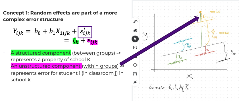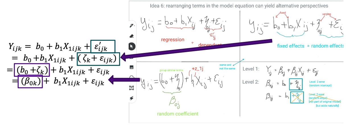 - And now regroup: \({Y_{ijk}} = ({b_0} + {\zeta_k}) + {b_1}{X_{1ijk}} + {\varepsilon_{ijk}}\).