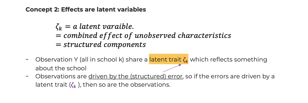 - We sometimes say that observations \(Y_{ijk}\), all in school k, share a latent trait \(\zeta_k\) that reflects something about the school.