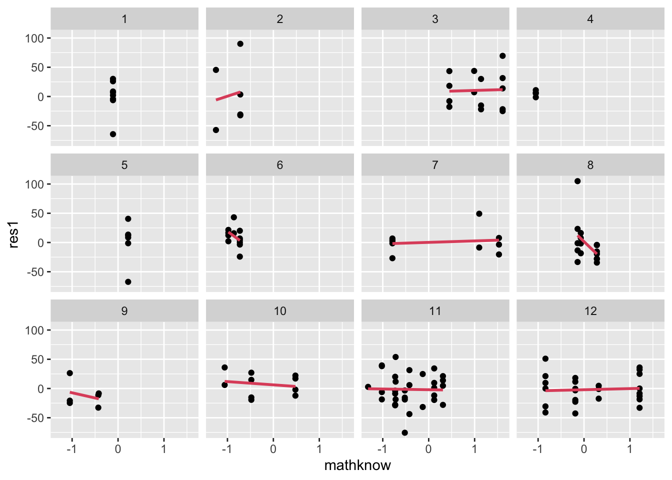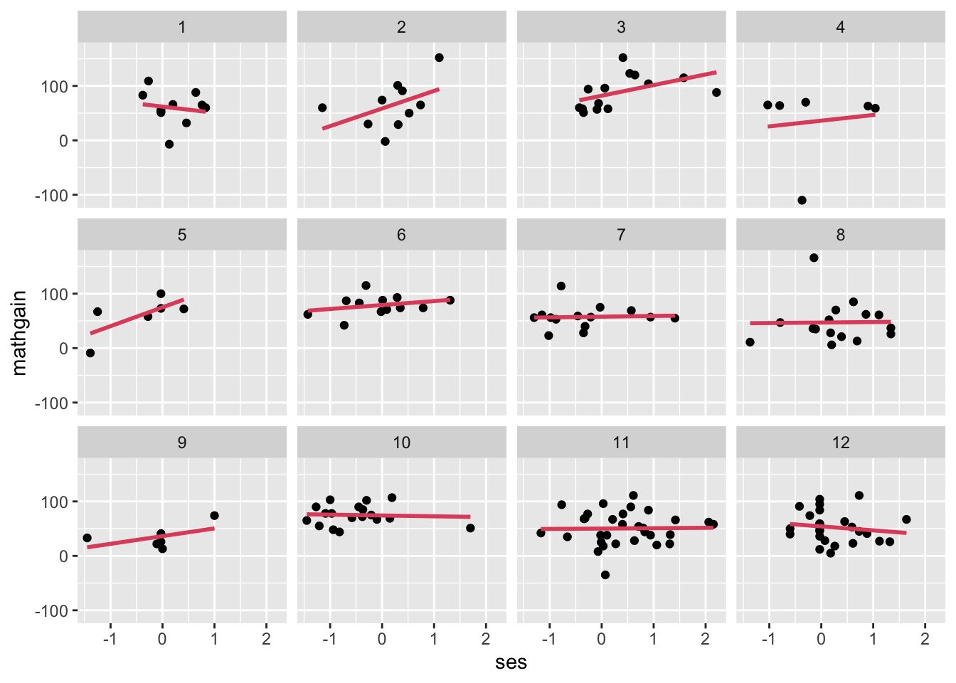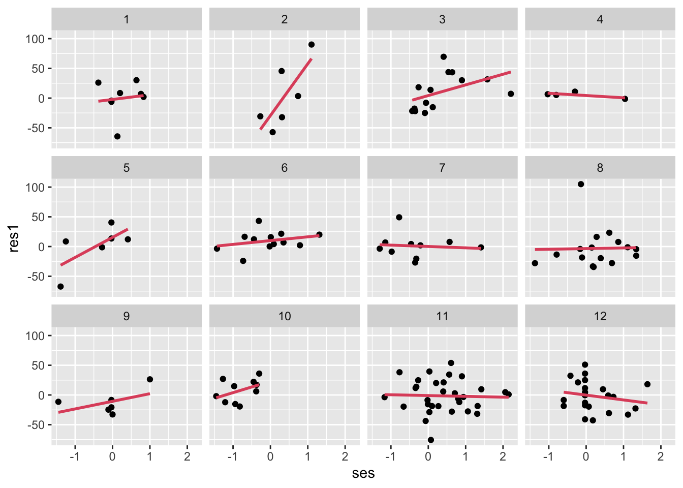 - Each facet (small plot) is a school; there should be no remaining relationship to SES in these residuals, right? But based on the residuals, there are likely some differences in SES slope, by school.
