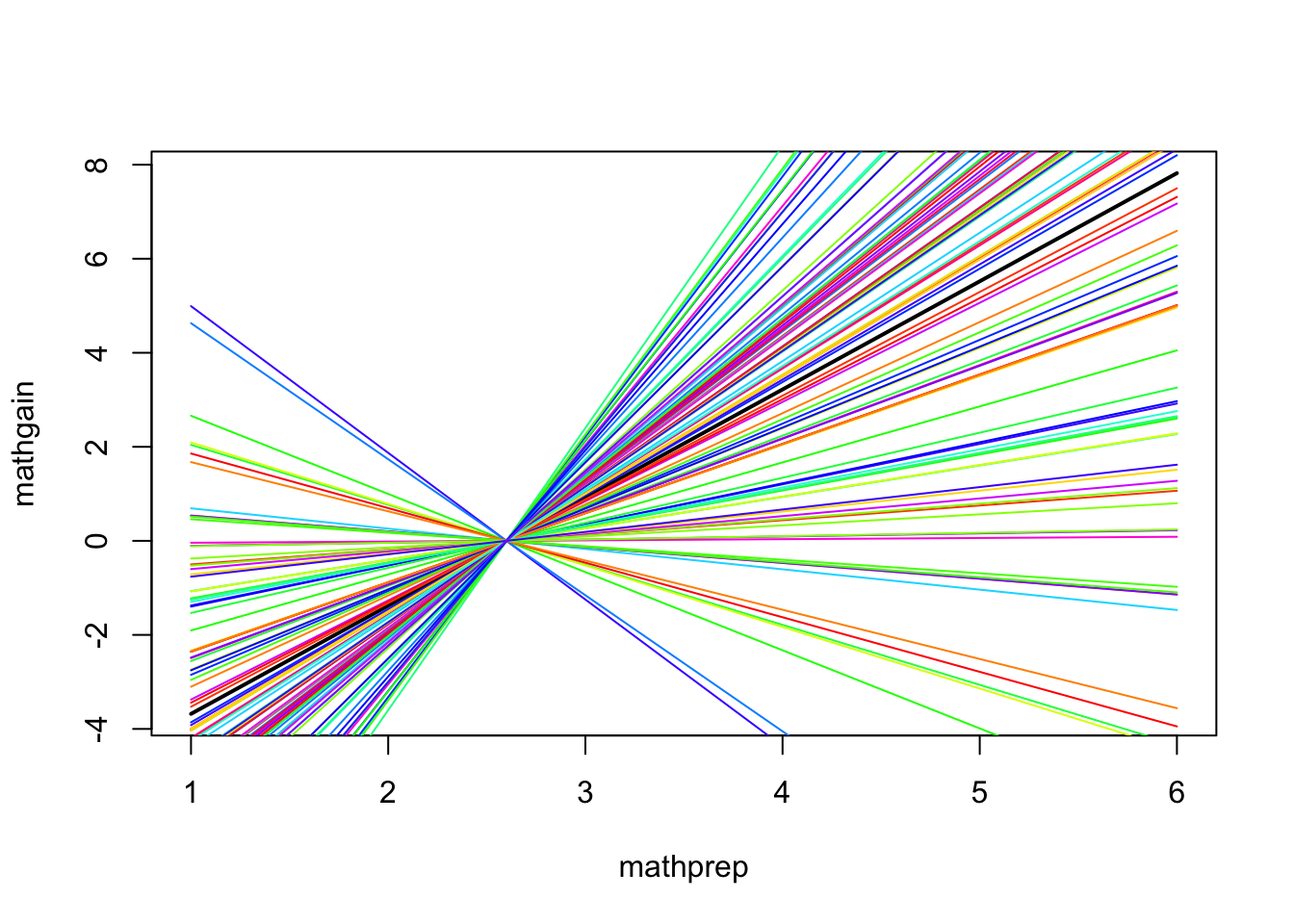 - All of the colors represent different schools, so these are varying returns to MATHPREP (we centered things so that all lines pass though the point (\(\overline{MATHPREP}\),0).