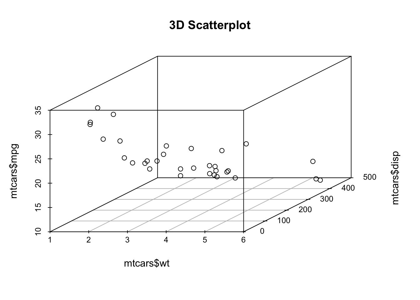 scatterplot3d()is a function to plot a 3-dimensional scatterplot with 3 variables fromscatterplot3dlibrary. Additionally,rgllibrary can be helpful in visualizing 3-dimensional scatterplot interactively. t has arguments as follows:x: the coordinates of points in x-axis