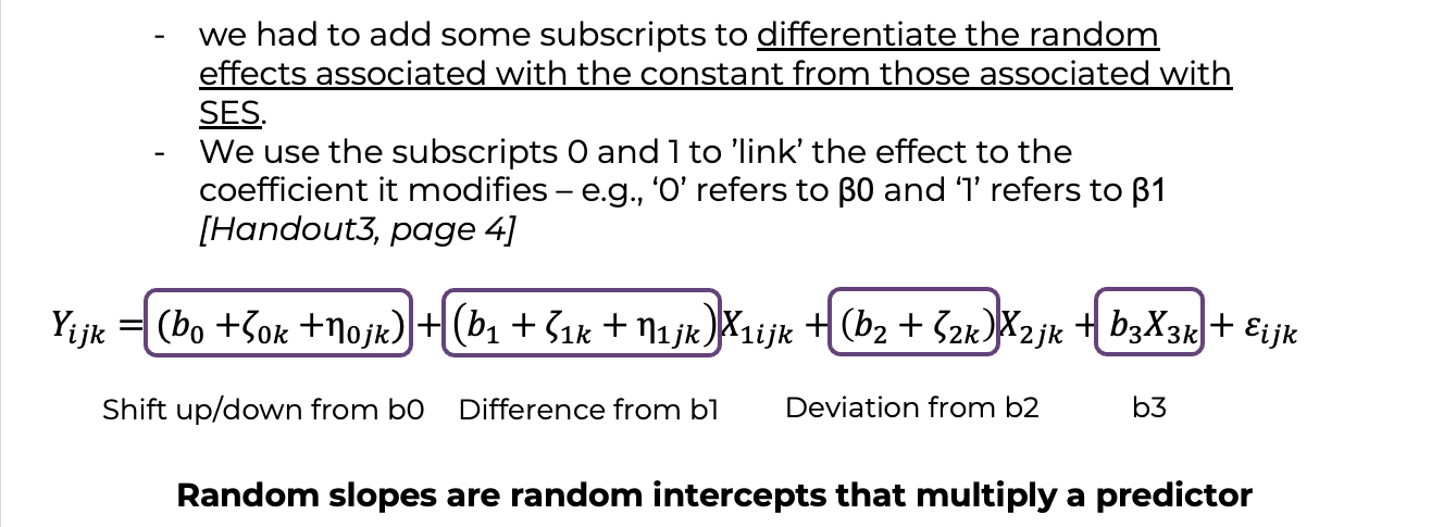 i (cont.). 1. Note that we had to add some subscripts to differentiate the random effects associated with the constant from those associated with SES. 2. Note as well that this notation is a bit harder to extend. For example, how would we add classroom-level random slopes for SES? ii. If the ‘returns’ to SES vary by classroom (j) within school (k), we need to change the index on the beta coefficient in front of SES to use the index ’jk’: