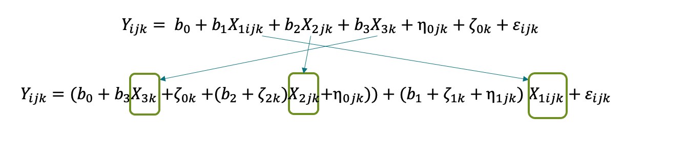 \[ \mbox{ with }\beta_{0jk} = b_0 + \eta_{0jk} + \zeta_{0k};\ \beta_{1jk} = b_1 + \eta_{1jk} + \zeta_{1k} \]