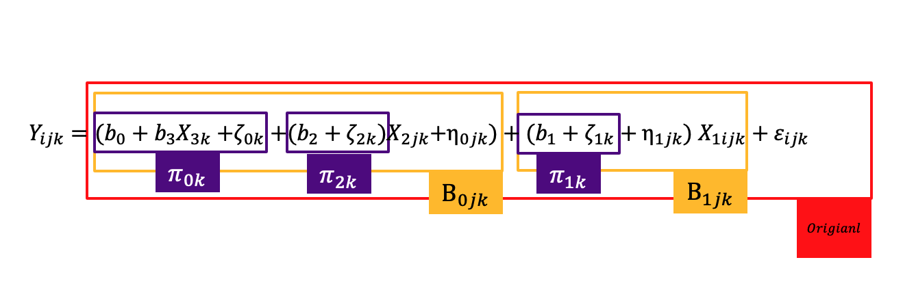 \[ \beta_{0jk} = b_0 + \eta_{0jk} + \zeta_{0k},\ \beta_{1k} = b_1 + \zeta_{1k} \]