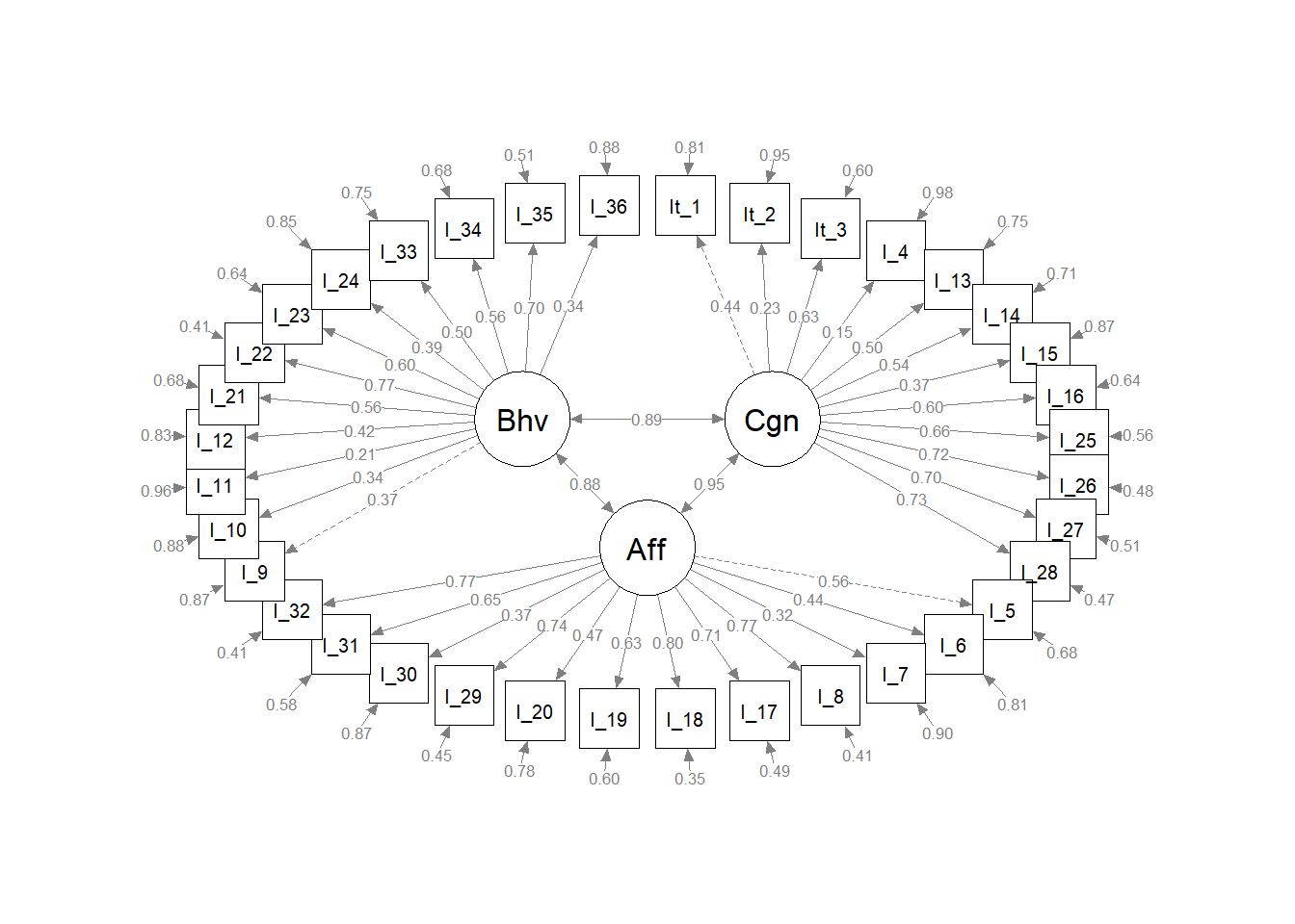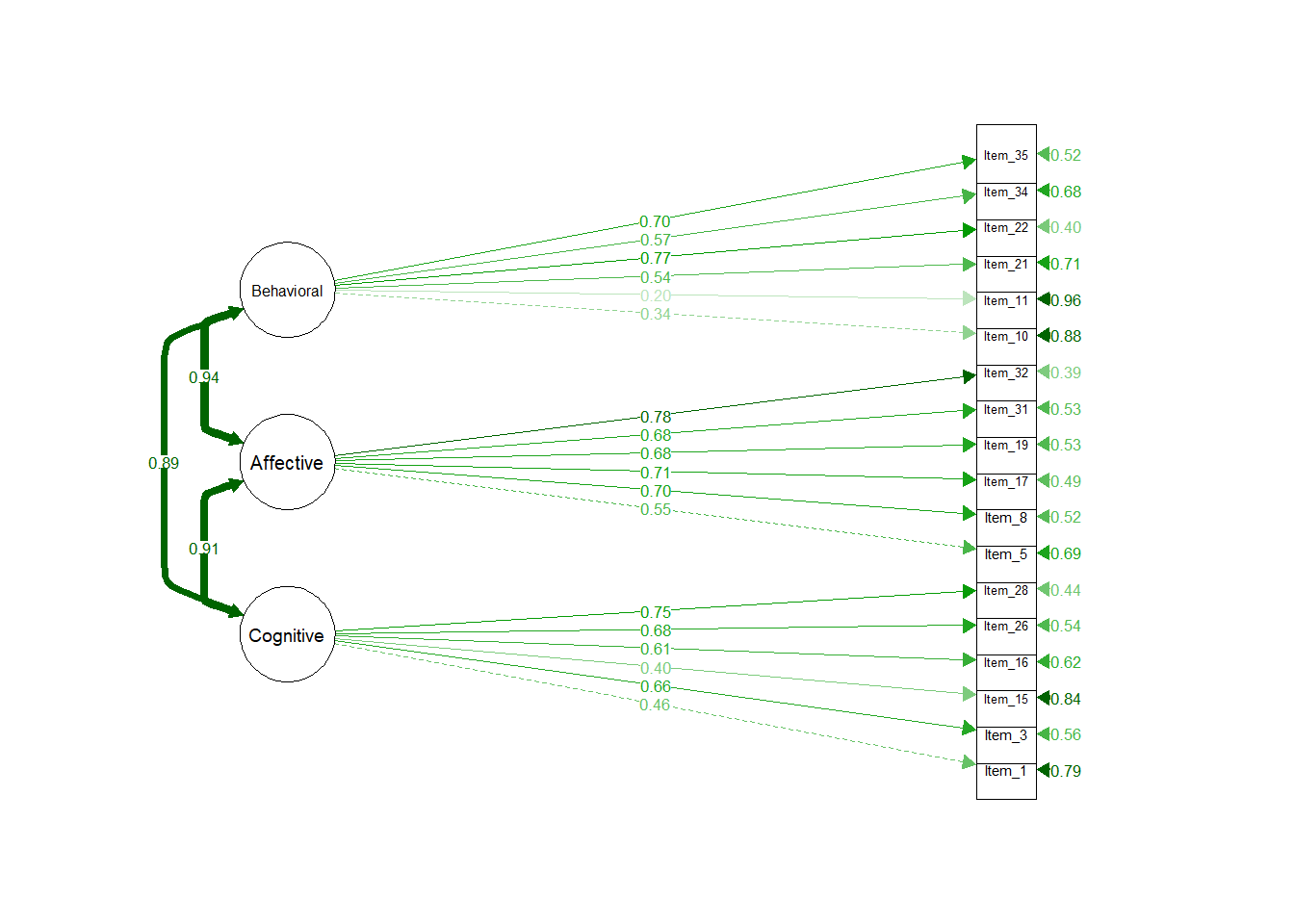 Scale reduction was performed from 36 to 22 items using modification indices from the two independent models. For example, if modification indices implicated residual covariances between substantive model indicators, and these indicators were furthermore potentially explained by the items both being, for example, “Affective”, then those items were retained. Similarly, if modification indices from the attitudinal model CFA implicated residual item covariances, and these items were associated via the substantive model, those two items were given preference for retention. This process became less instructive after the reduction of 14 items. The goal of the assessment was a finalized 18 (6 per dimension and 2 per dimensional “intersection”), so we prioritized empirial factor loadings (from both substantive and attitudinal models) for the final 4 item reductions. This resulted in two possible final scale definitions: one giving “priority” to the attitudinal model, and one giving “priority” to information extracted from the substantive model.