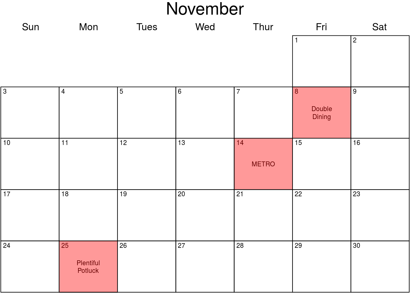 | Plentiful Potluck | 11/25/2019 | 12:00-2:00PM | Every member of the program can bring some food to mingle with each other. People can filter in and out while enjoying some great snacks. | On-Campus: Dickson Hall Room 259 | NA | |