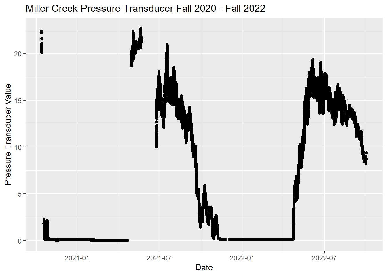 As of 2022-11-29, an insufficient number of discharge observations exist to make a reliable discharge rating curve for Miller Creek. As a result, the pressure transducer data in ?? is shown in raw form rather than as converted to stream discharge values.