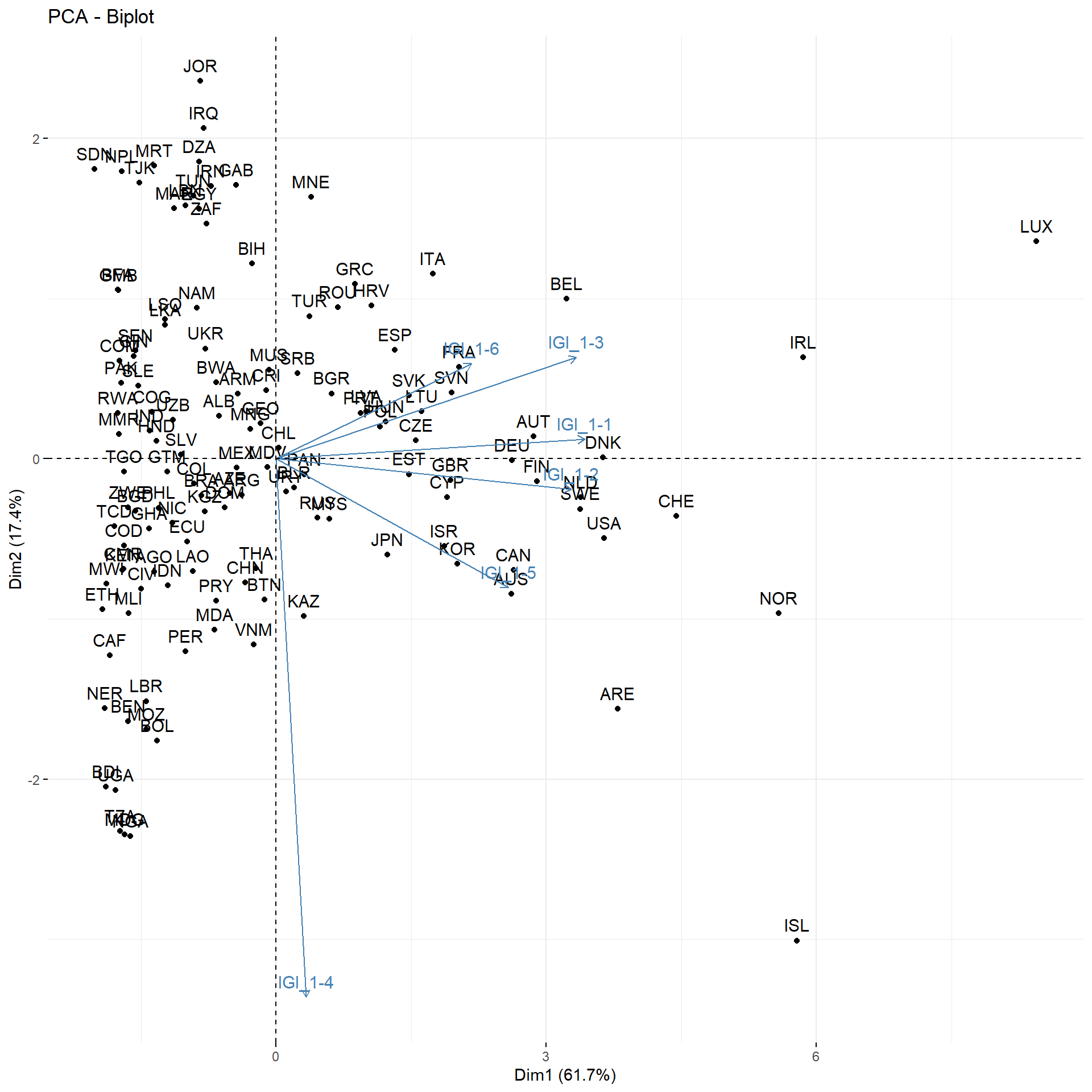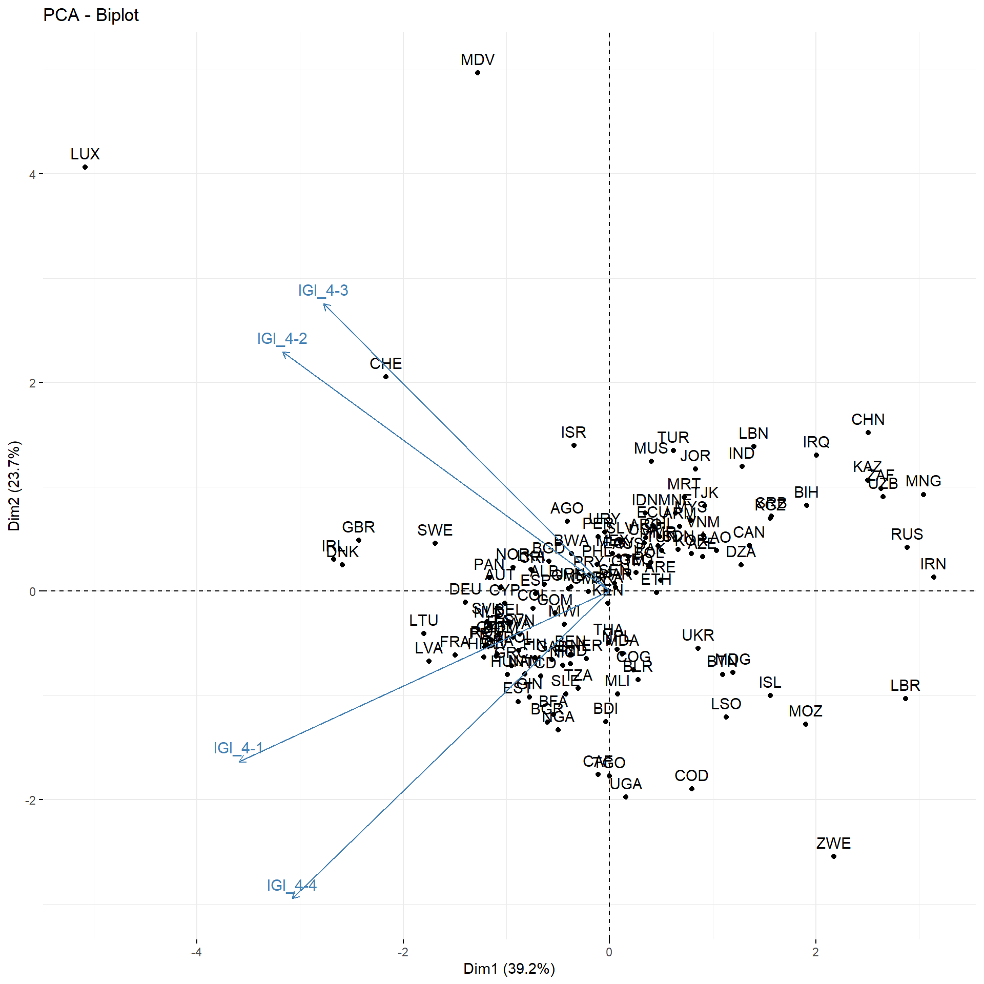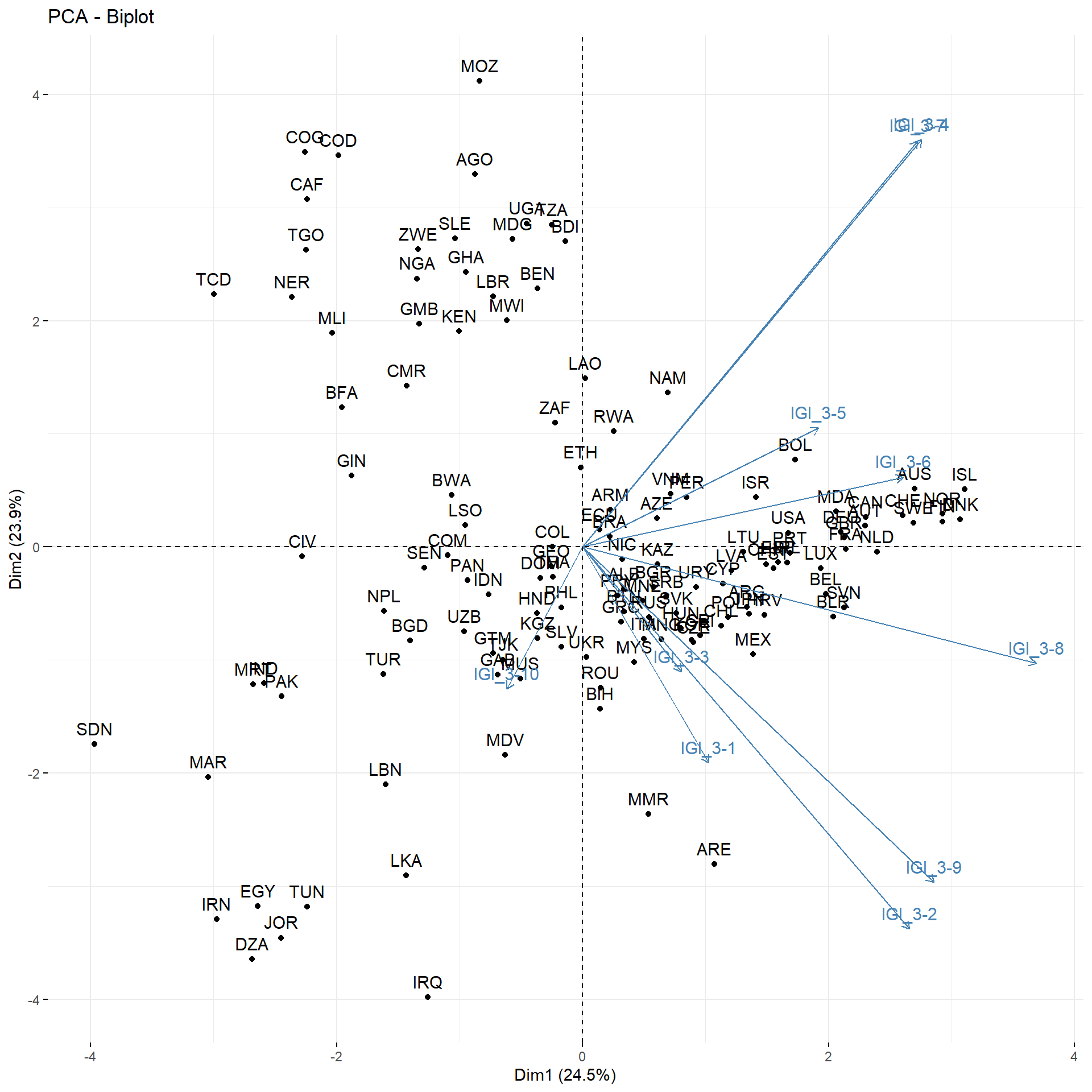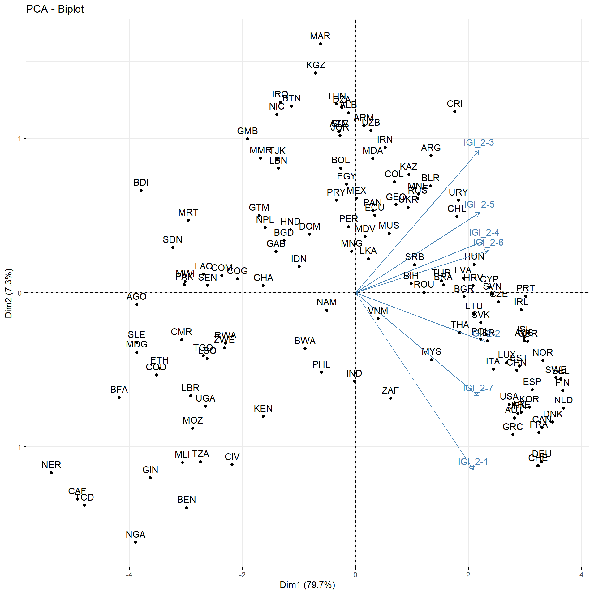 In this case, the first component (interpreted as Economic Development) accounts for 61.8 per cent of total variance. The second component (Employment) accounts for 17.4 per cent of total variance. Interpretation of dimensions is adopted based on the original publication of the index (UNCTAD and EEC 2019).