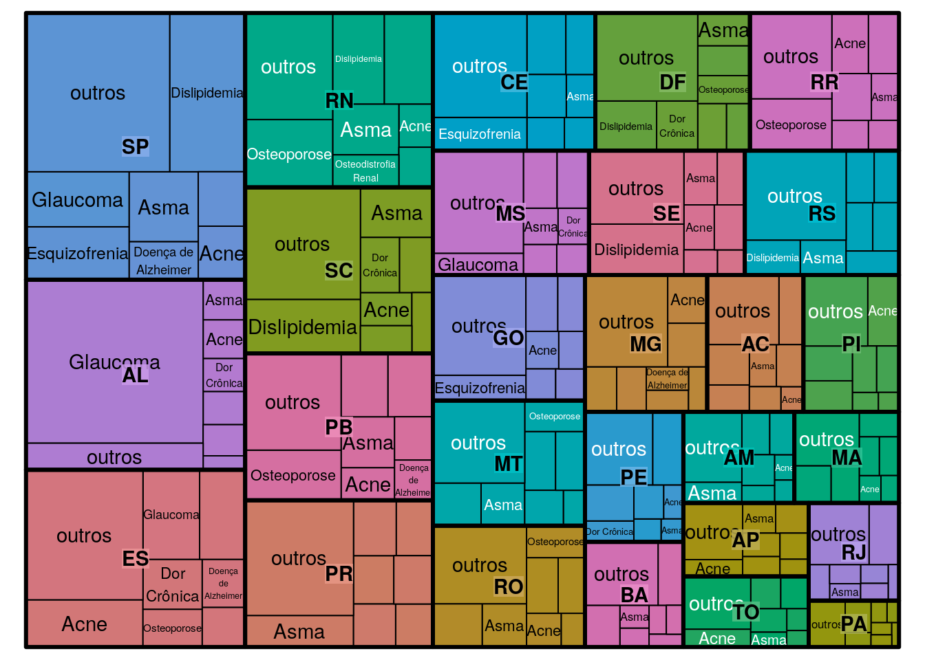 - São listadas apenas os 6 PCDT mais frequentes para cada estado em número de usuários.