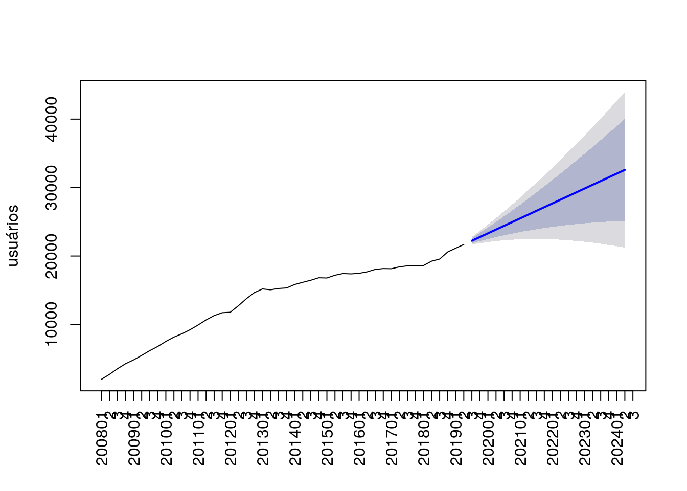 3.10 Extrapole - Número de usuários atentidos por trimestre e previstos com o método ARIMA - D