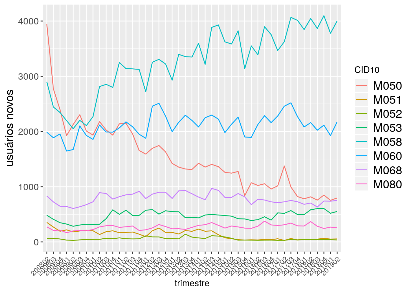 Número de usuários novos por trimestre para cada diagnóstico relativo ao Protocolo Clínico e Diretrizes Terapêuticas (PCDT).